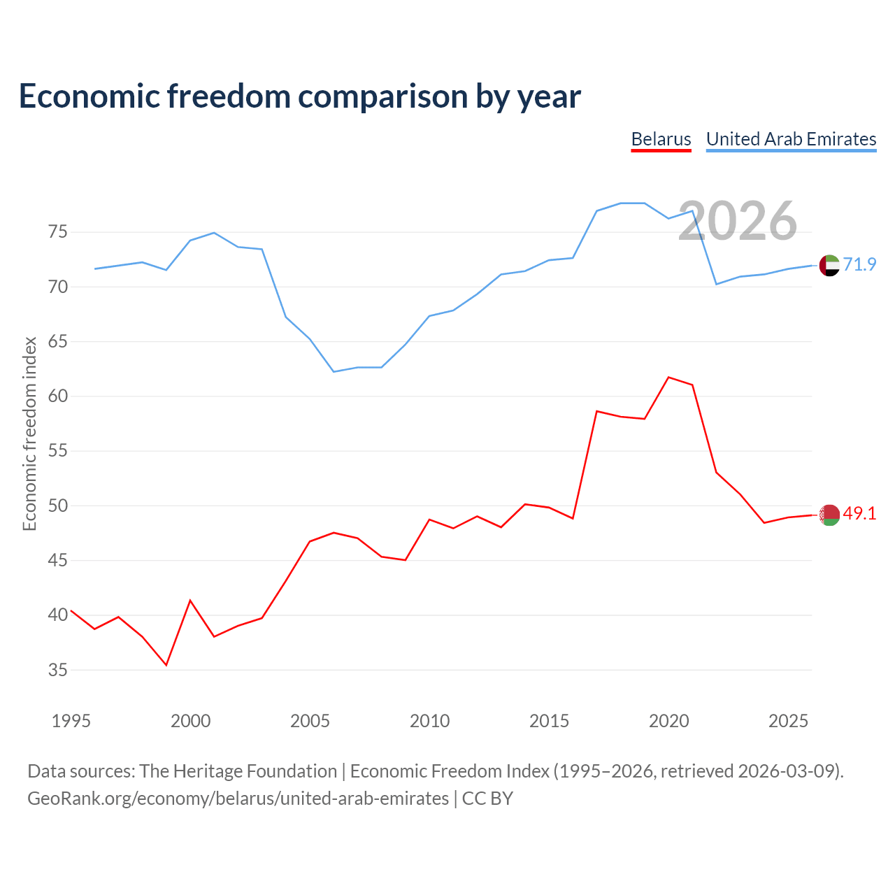 The Economic Freedom Index for Belarus is 49.1, ranking 166/197, compared to 71.9 for the United Arab Emirates, ranking 29/197. The chart above displays a comparison of annual changes in economic freedom indexes.