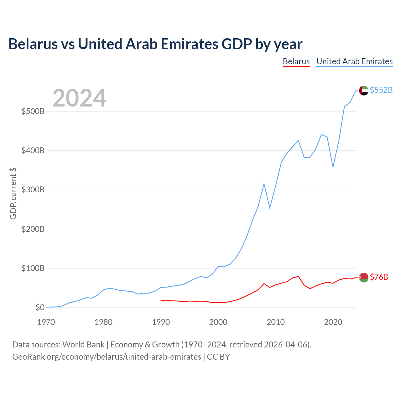 Belarus has a GDP of $76B compared to $552B for the United Arab Emirates, ranking 83/197 and 27/197 by economy size, respectively.