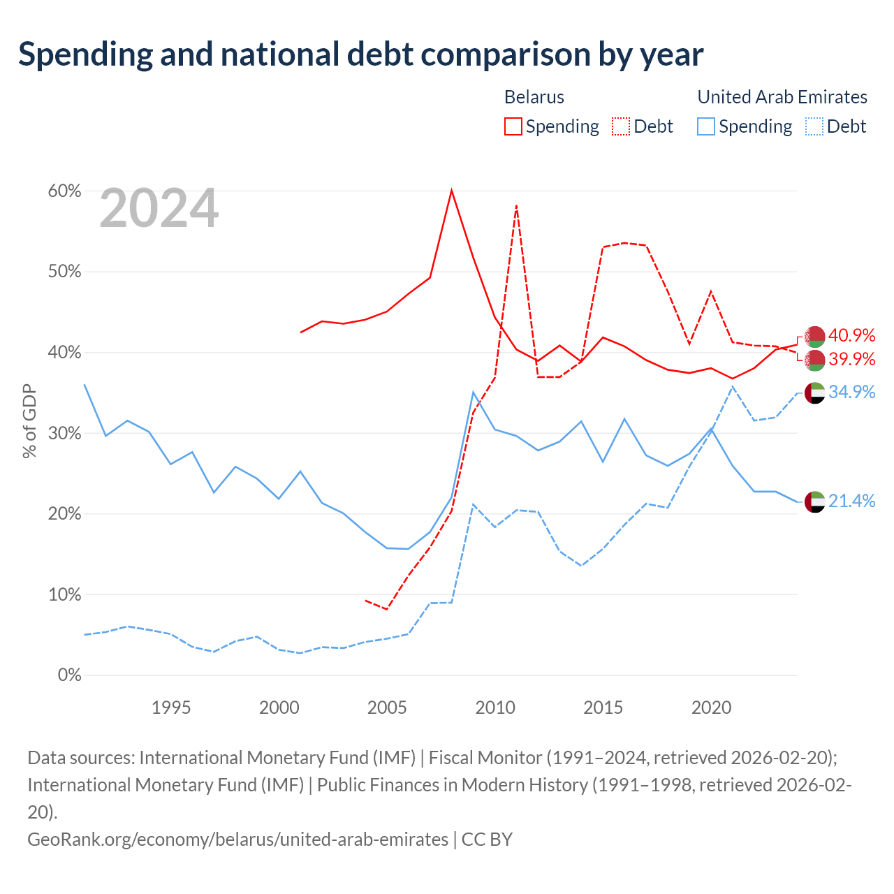 Belarus has $30.3B in government debt (39.9% of GDP), compared to $193B (34.9% of GDP) in the United Arab Emirates.