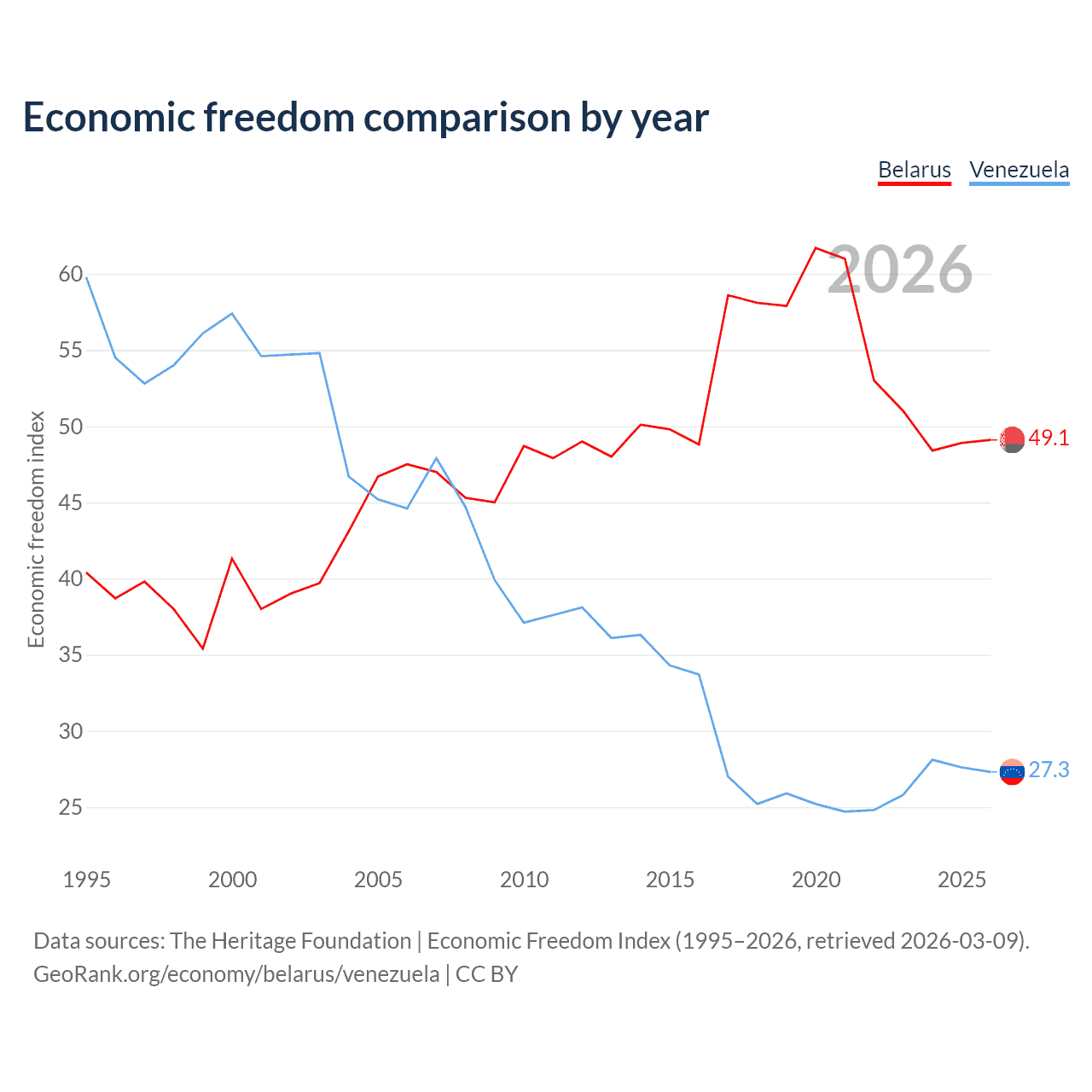 The Economic Freedom Index for Belarus is 49.1, ranking 166/197, compared to 27.3 for Venezuela, ranking 194/197. The chart above displays a comparison of annual changes in economic freedom indexes.