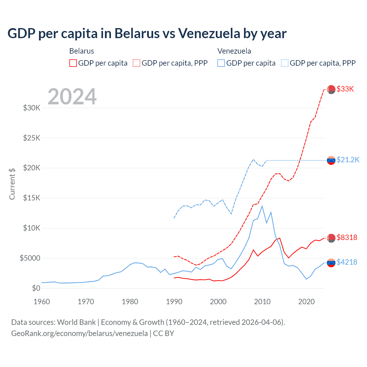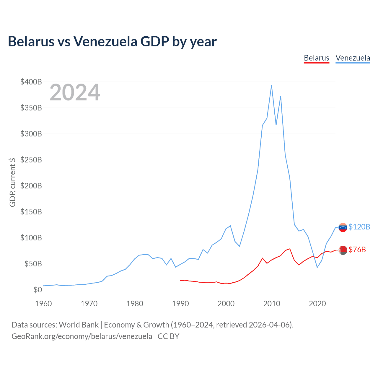 Belarus has a GDP of $76B compared to $120B for Venezuela, ranking 83/197 and 65/197 by economy size, respectively.
