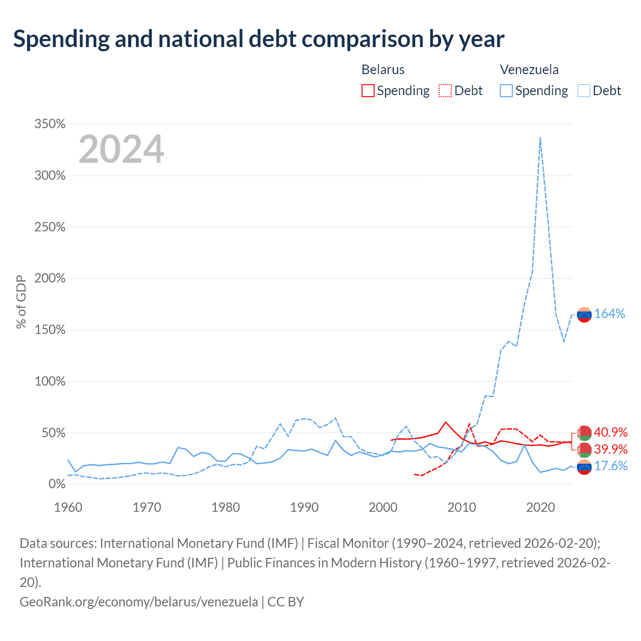 Belarus has $30.3B in government debt (39.9% of GDP), compared to $197B (164.3% of GDP) in Venezuela.