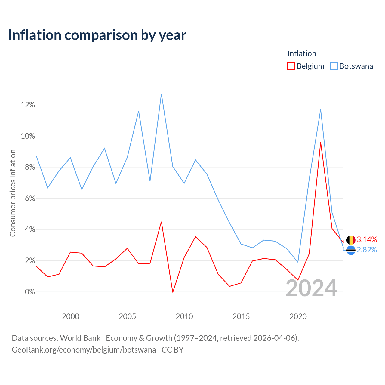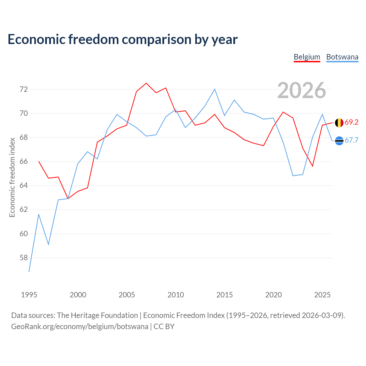 The Economic Freedom Index for Belgium is 69.2, ranking 42/197, compared to 67.7 for Botswana, ranking 53/197. The chart above displays a comparison of annual changes in economic freedom indexes.