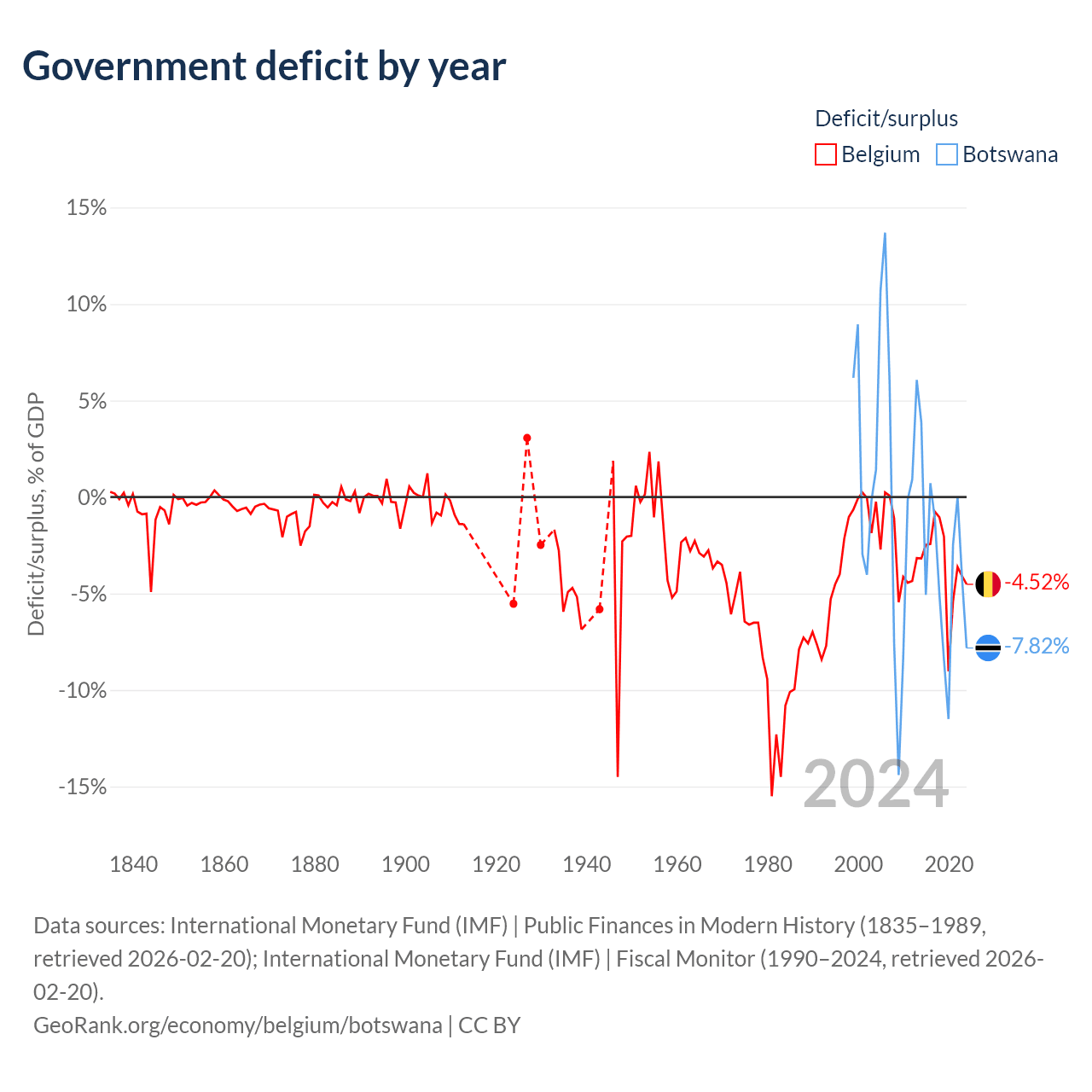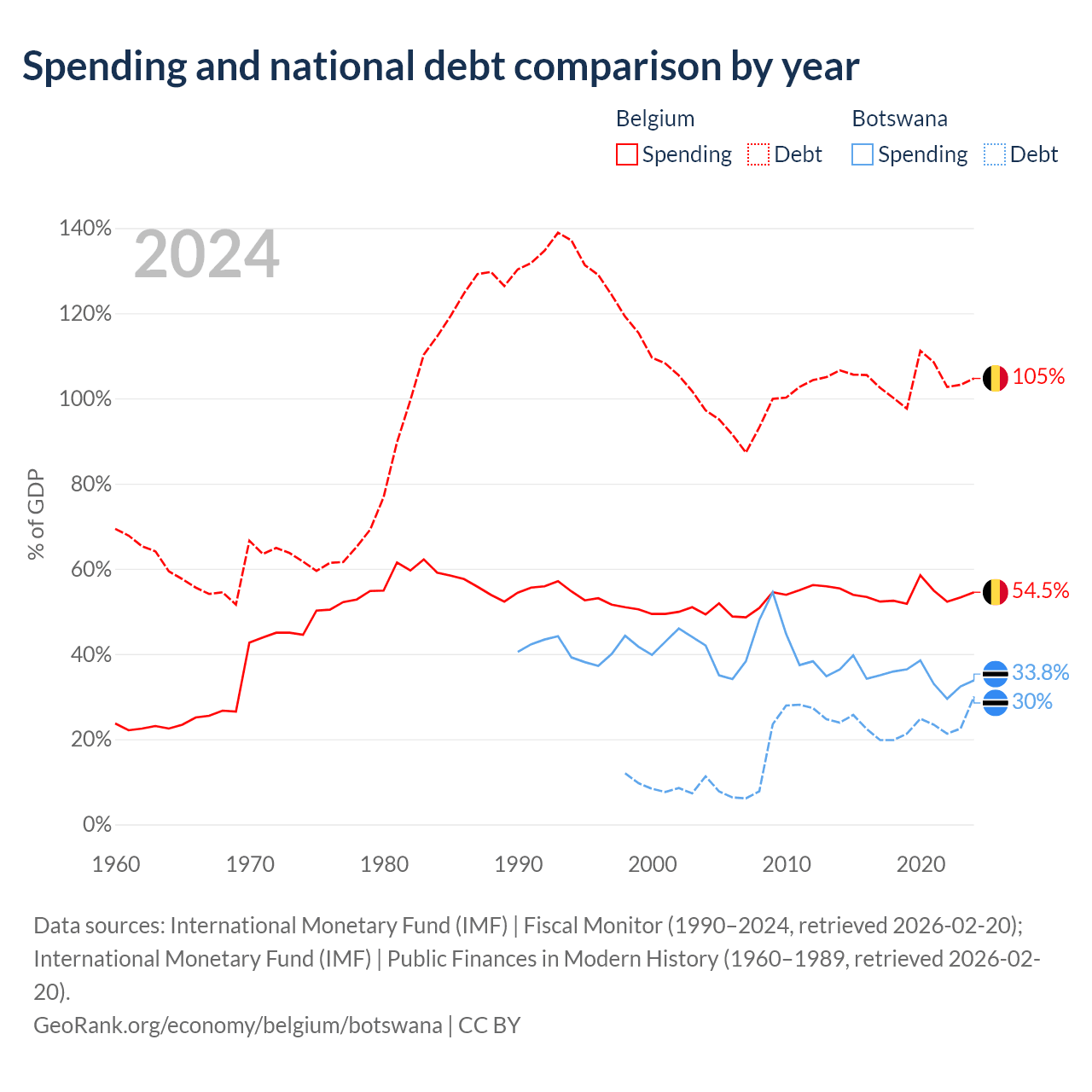 Belgium has $703B in government debt (104.7% of GDP), compared to $5.82B (30% of GDP) in Botswana.