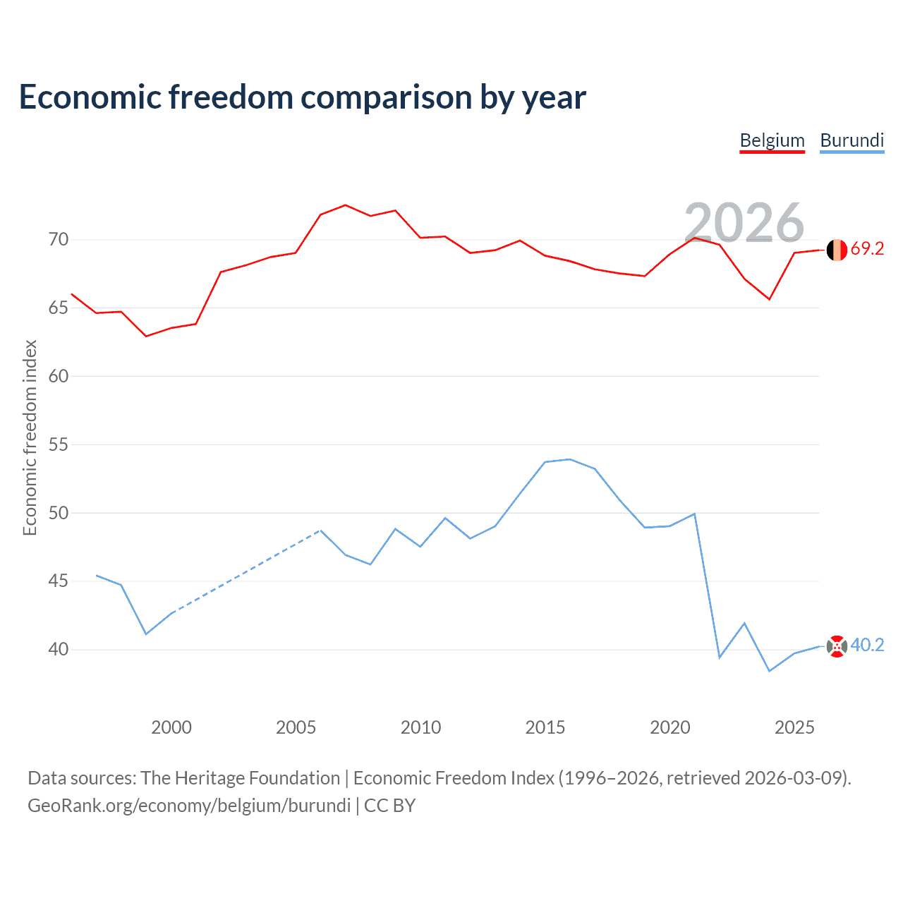 The Economic Freedom Index for Belgium is 69.2, ranking 42/197, compared to 40.2 for Burundi, ranking 187/197. The chart above displays a comparison of annual changes in economic freedom indexes.
