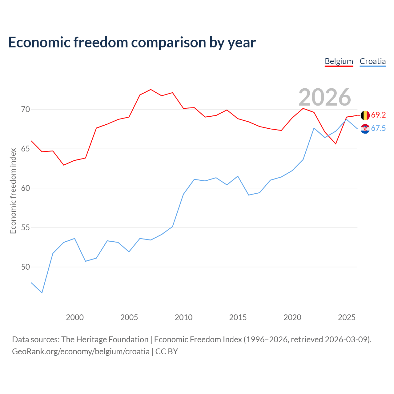 The Economic Freedom Index for Belgium is 69.2, ranking 42/197, compared to 67.5 for Croatia, ranking 56/197. The chart above displays a comparison of annual changes in economic freedom indexes.