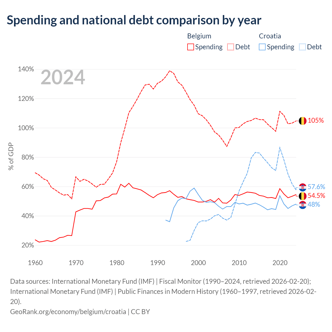 Belgium has $703B in government debt (104.7% of GDP), compared to $53.5B (57.6% of GDP) in Croatia.