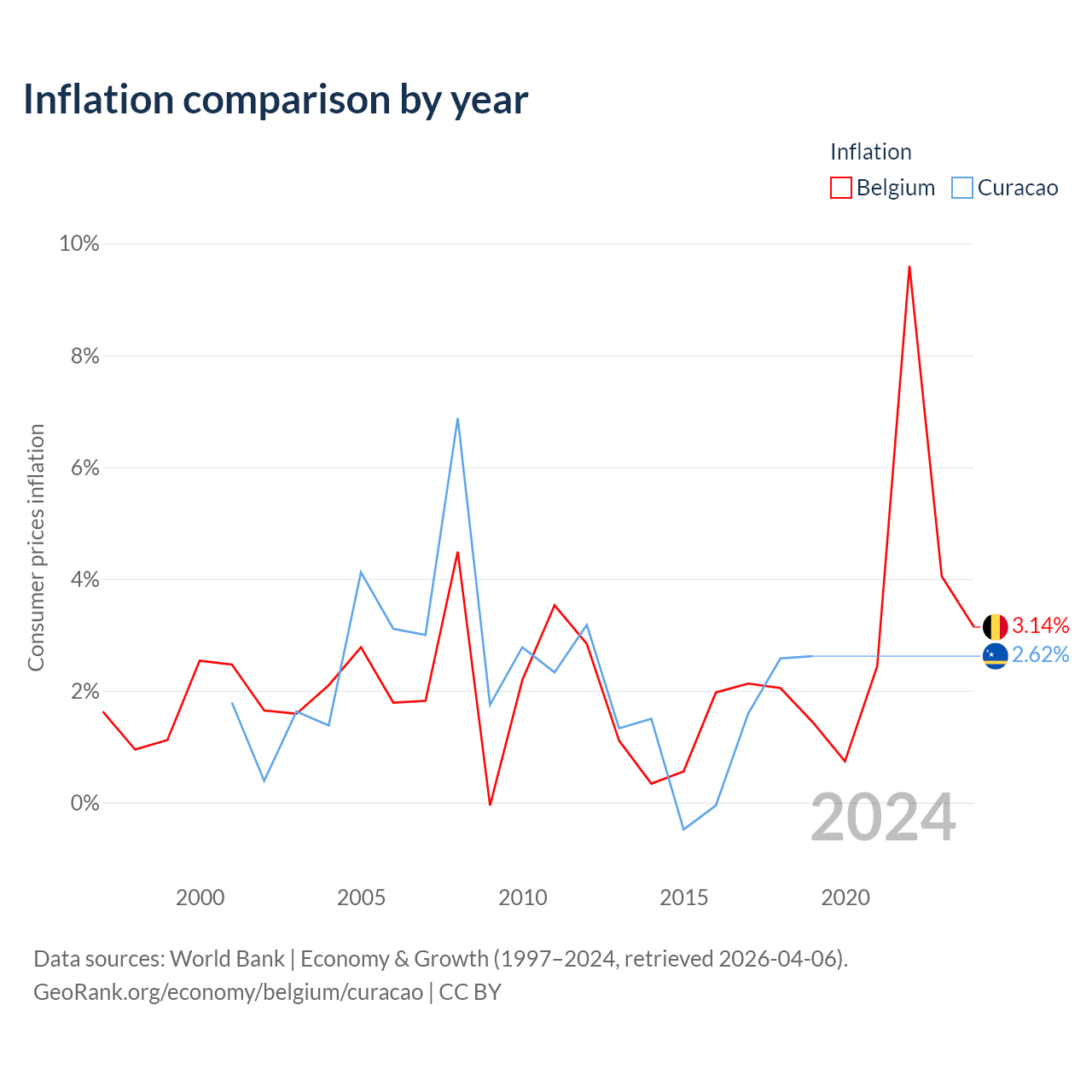 Belgium has a GDP of $671B compared to $3.56B for Curacao, ranking 23/197 and 167/197 by economy size, respectively.