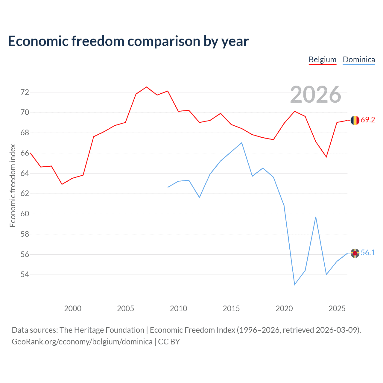 The Economic Freedom Index for Belgium is 69.2, ranking 42/197, compared to 56.1 for Dominica, ranking 124/197. The chart above displays a comparison of annual changes in economic freedom indexes.