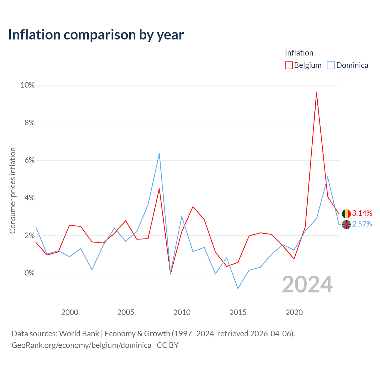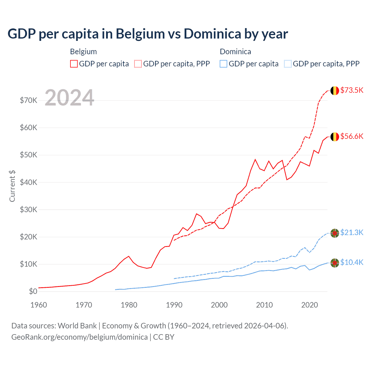 Belgium has a GDP of $671B compared to $689M for Dominica, ranking 23/197 and 190/197 by economy size, respectively.
