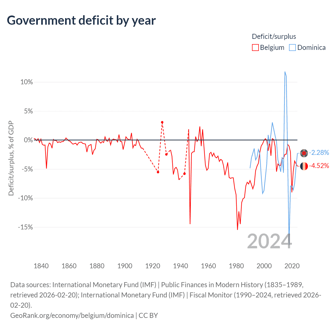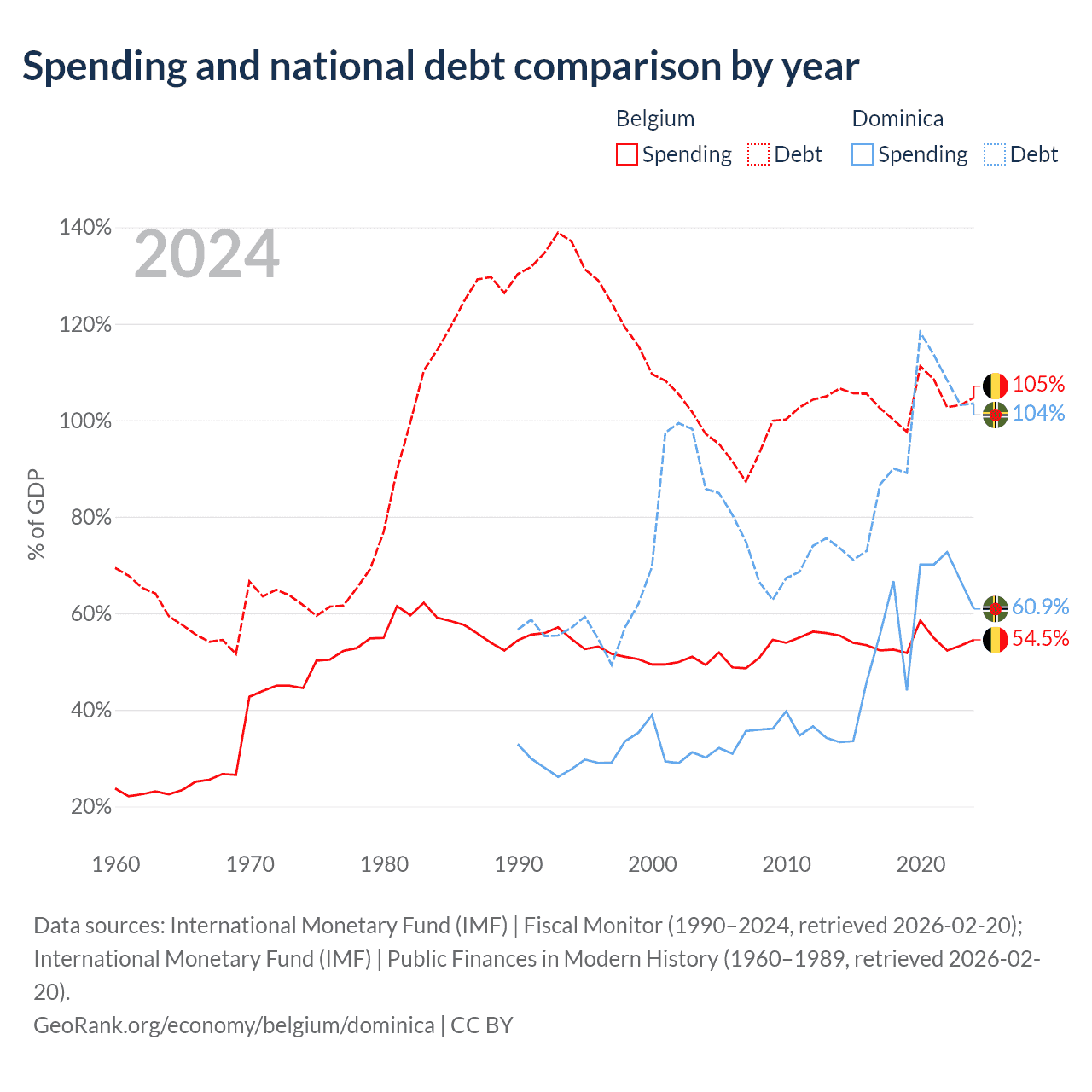 Belgium has $703B in government debt (104.7% of GDP), compared to $713M (103.5% of GDP) in Dominica.