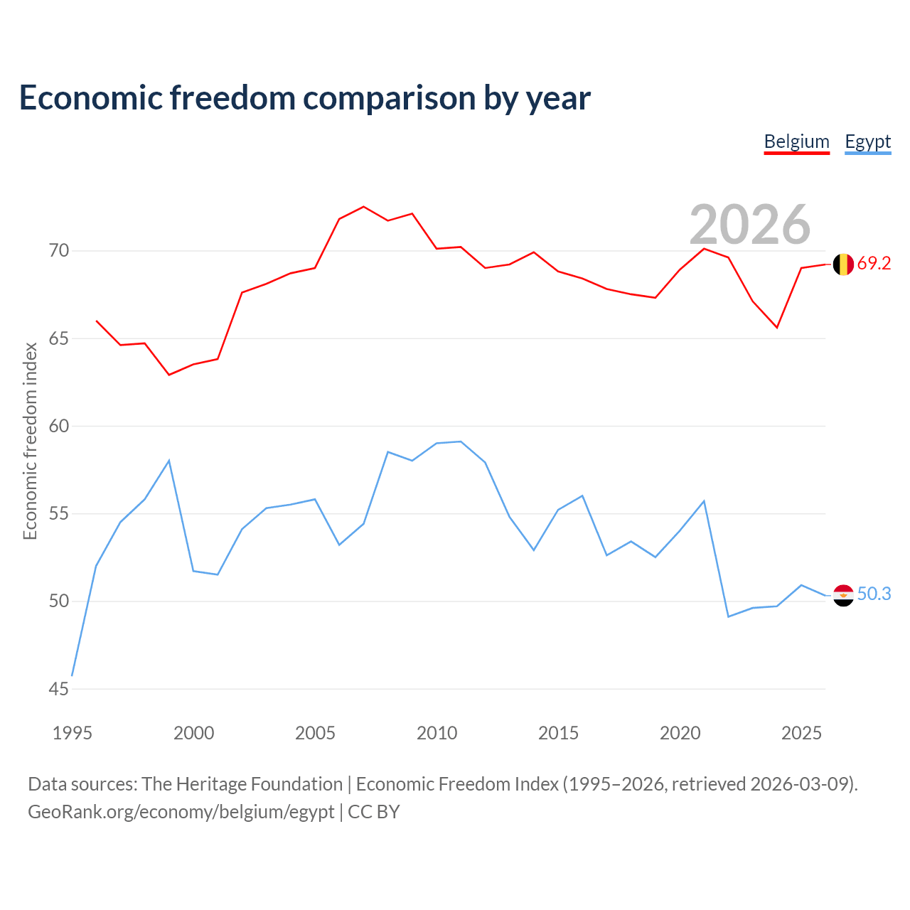 The Economic Freedom Index for Belgium is 69.2, ranking 42/197, compared to 50.3 for Egypt, ranking 160/197. The chart above displays a comparison of annual changes in economic freedom indexes.