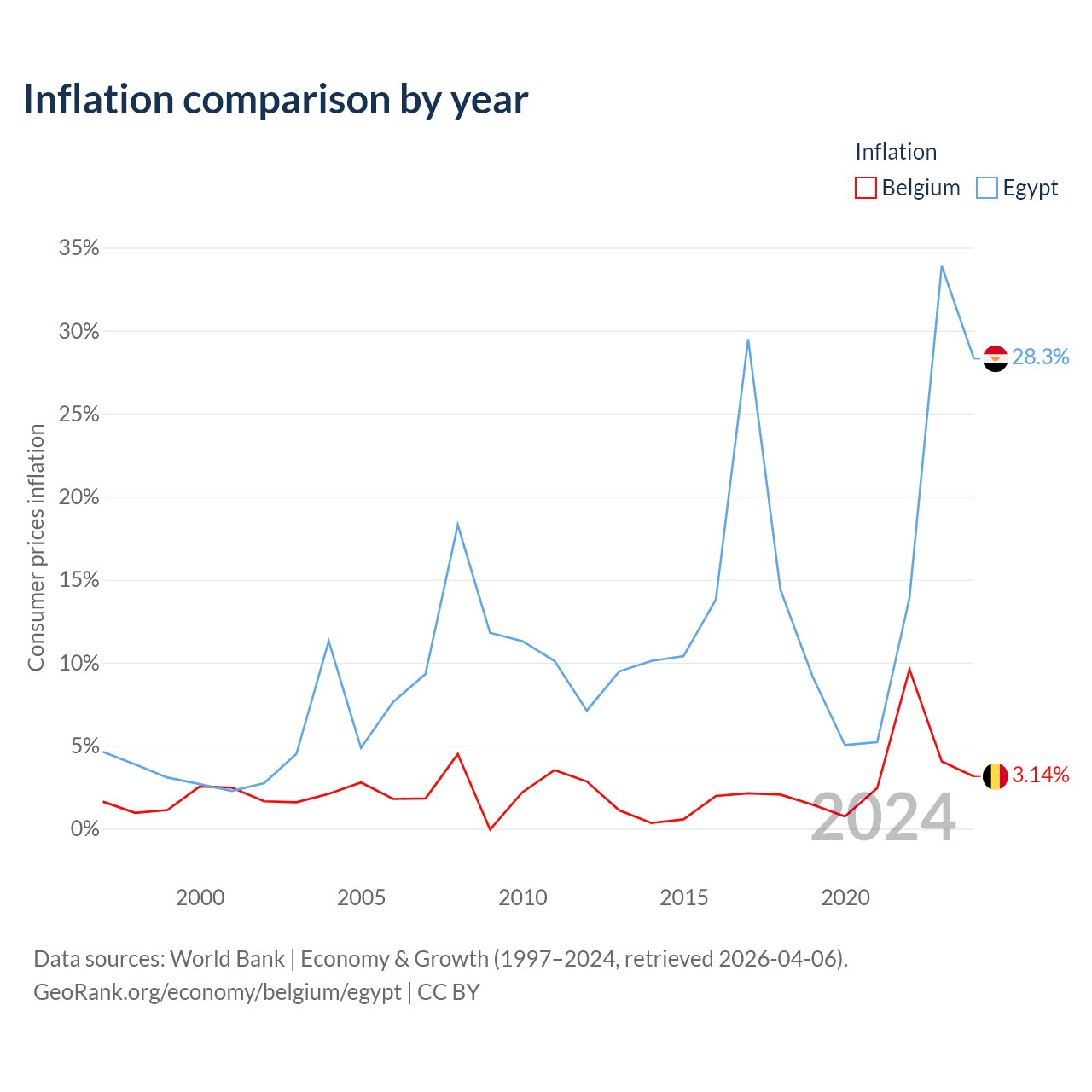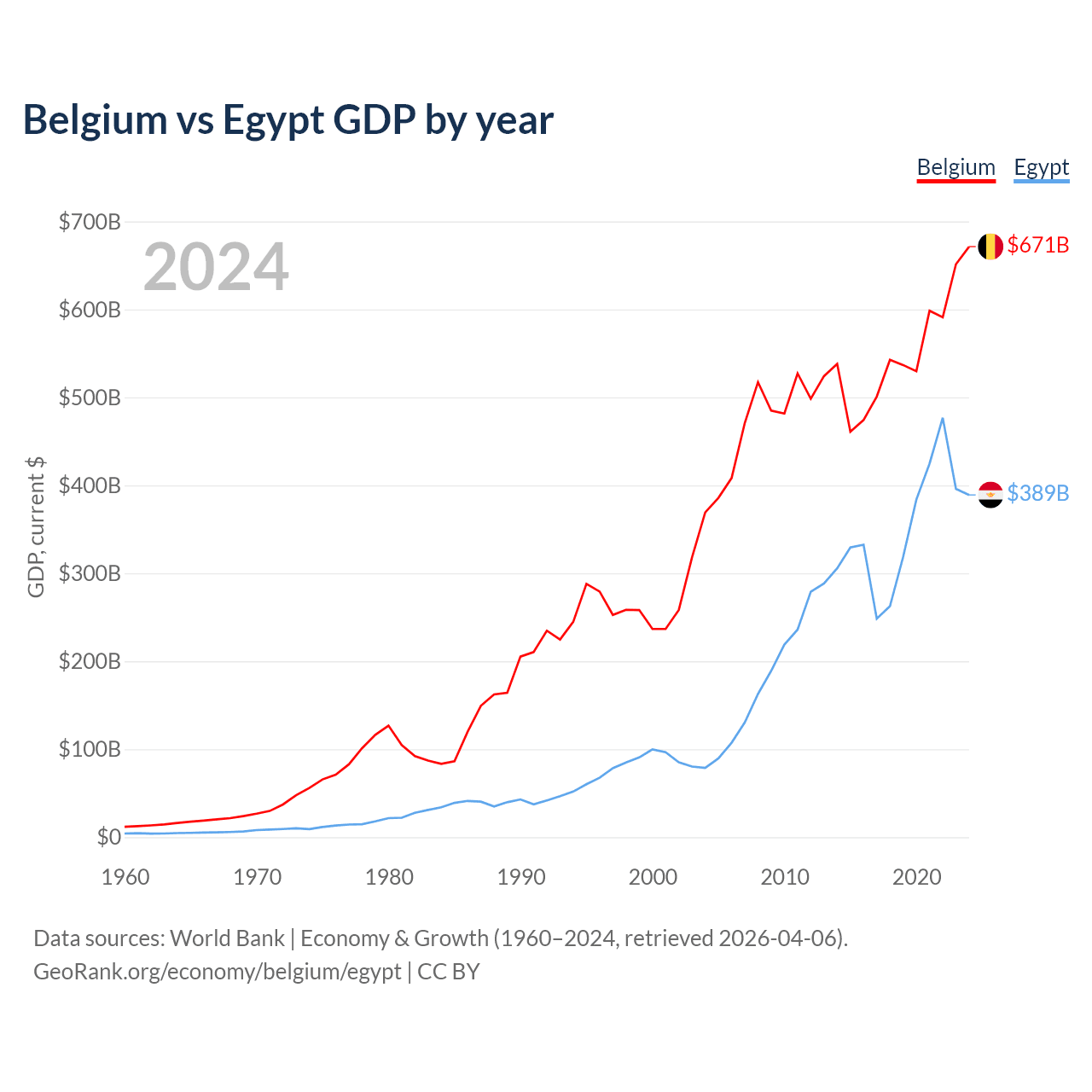 Belgium has a GDP of $671B compared to $389B for Egypt, ranking 23/197 and 41/197 by economy size, respectively.