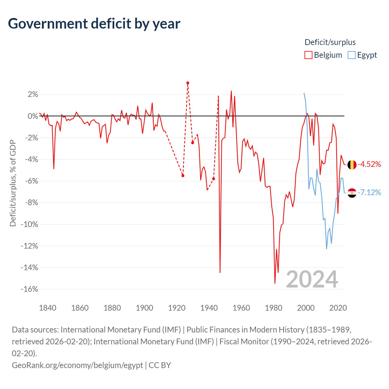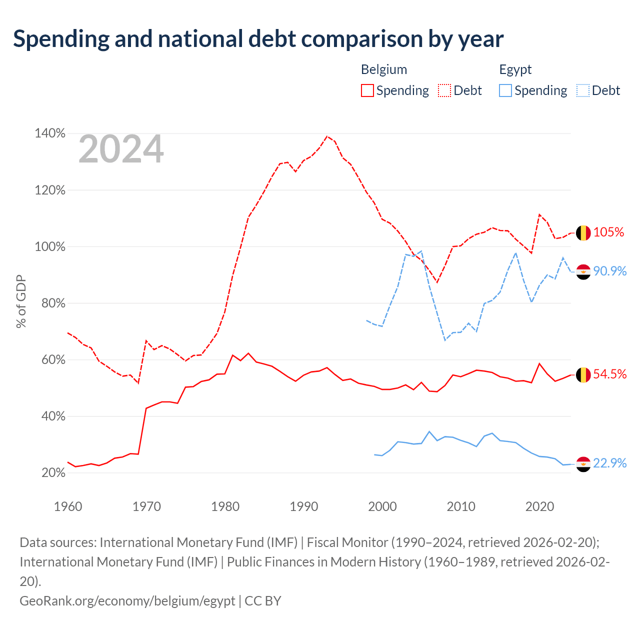 Belgium has $703B in government debt (104.7% of GDP), compared to $354B (90.9% of GDP) in Egypt.
