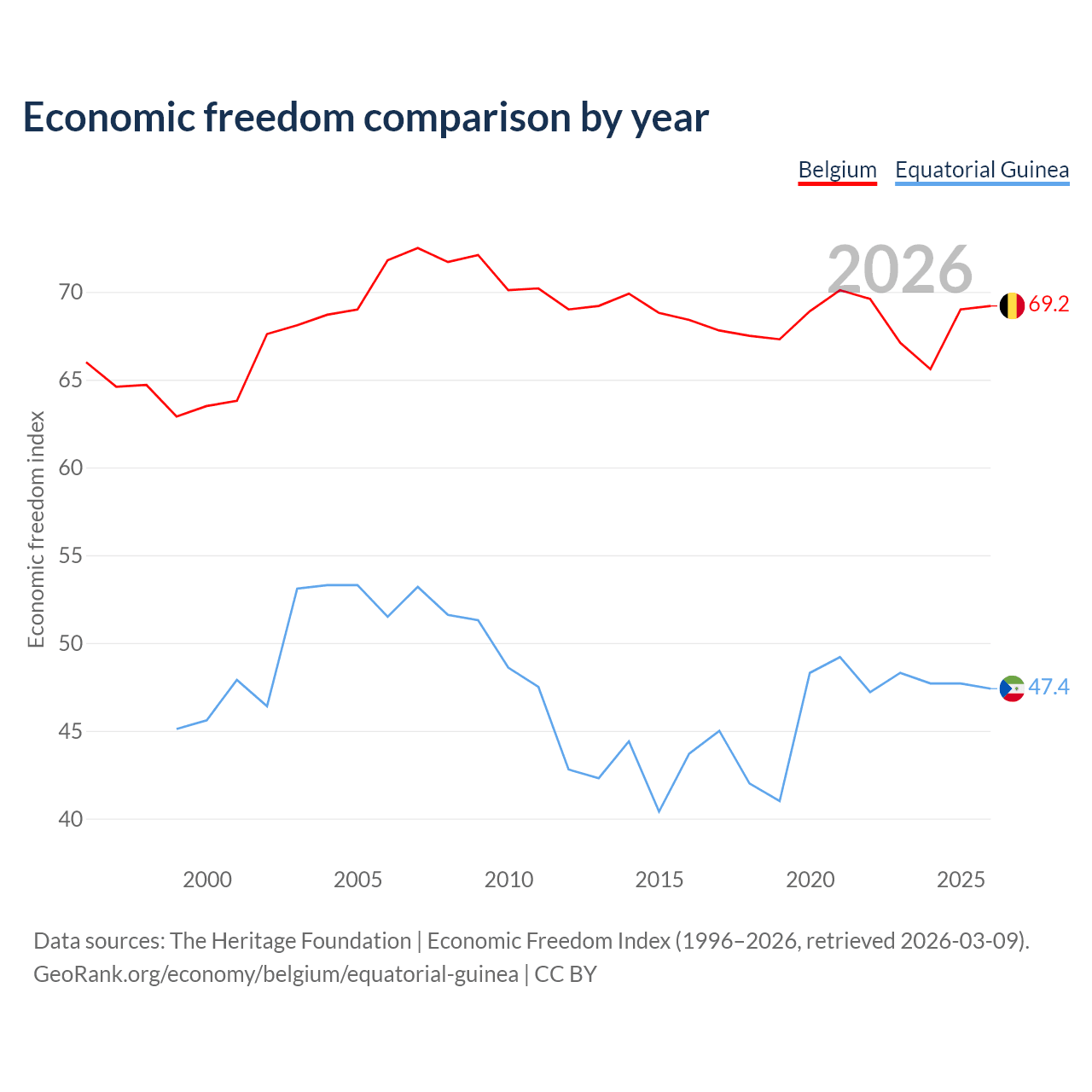 The Economic Freedom Index for Belgium is 69.2, ranking 42/197, compared to 47.4 for Equatorial Guinea, ranking 175/197. The chart above displays a comparison of annual changes in economic freedom indexes.