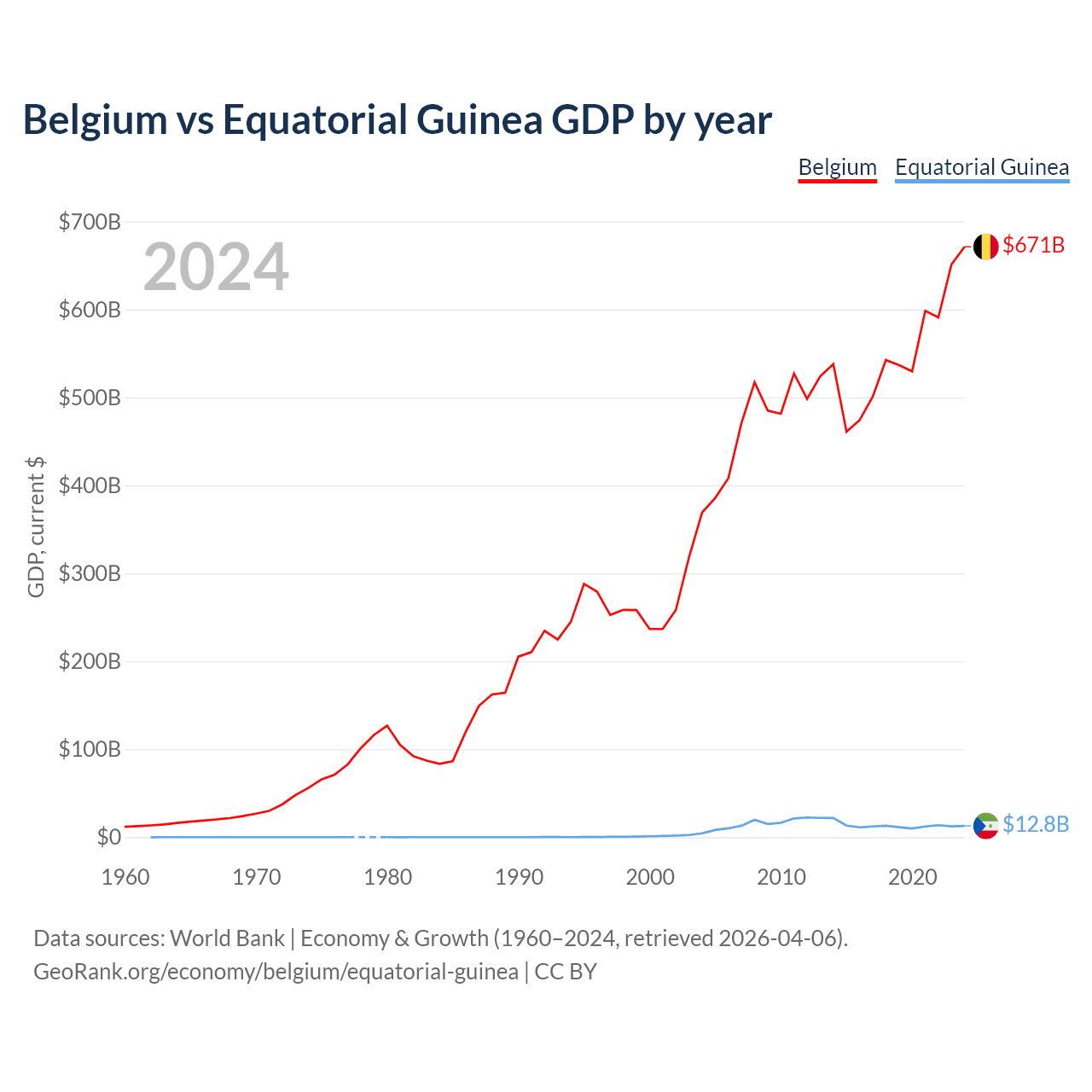 Belgium has a GDP of $671B compared to $12.8B for Equatorial Guinea, ranking 23/197 and 148/197 by economy size, respectively.