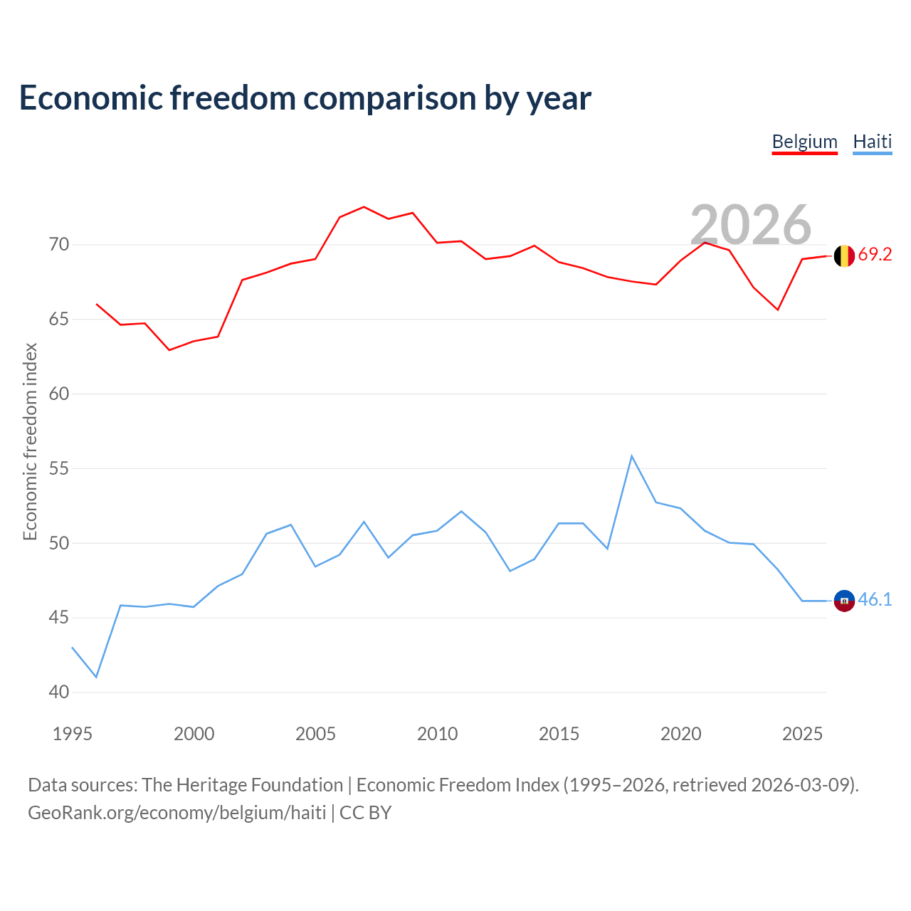 The Economic Freedom Index for Belgium is 69.2, ranking 42/197, compared to 46.1 for Haiti, ranking 178/197. The chart above displays a comparison of annual changes in economic freedom indexes.