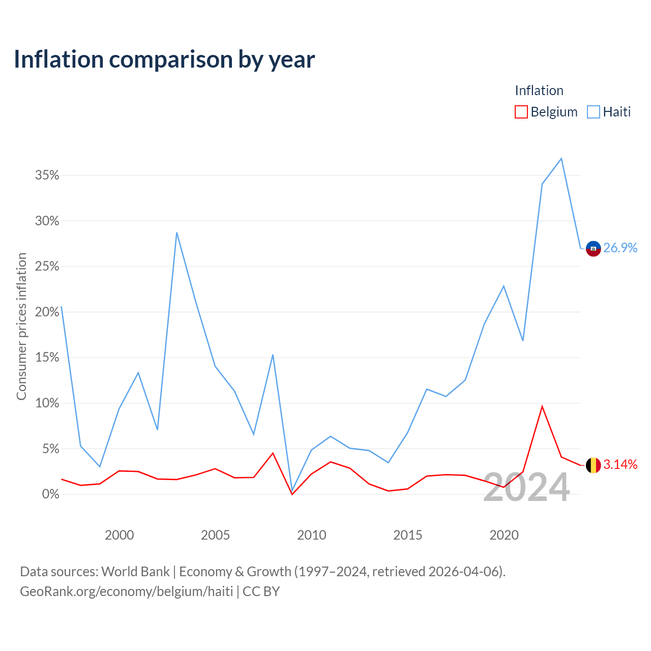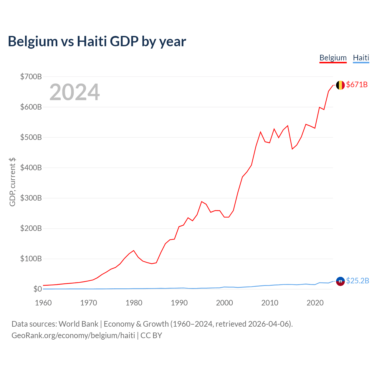 Belgium has a GDP of $671B compared to $25.2B for Haiti, ranking 23/197 and 117/197 by economy size, respectively.