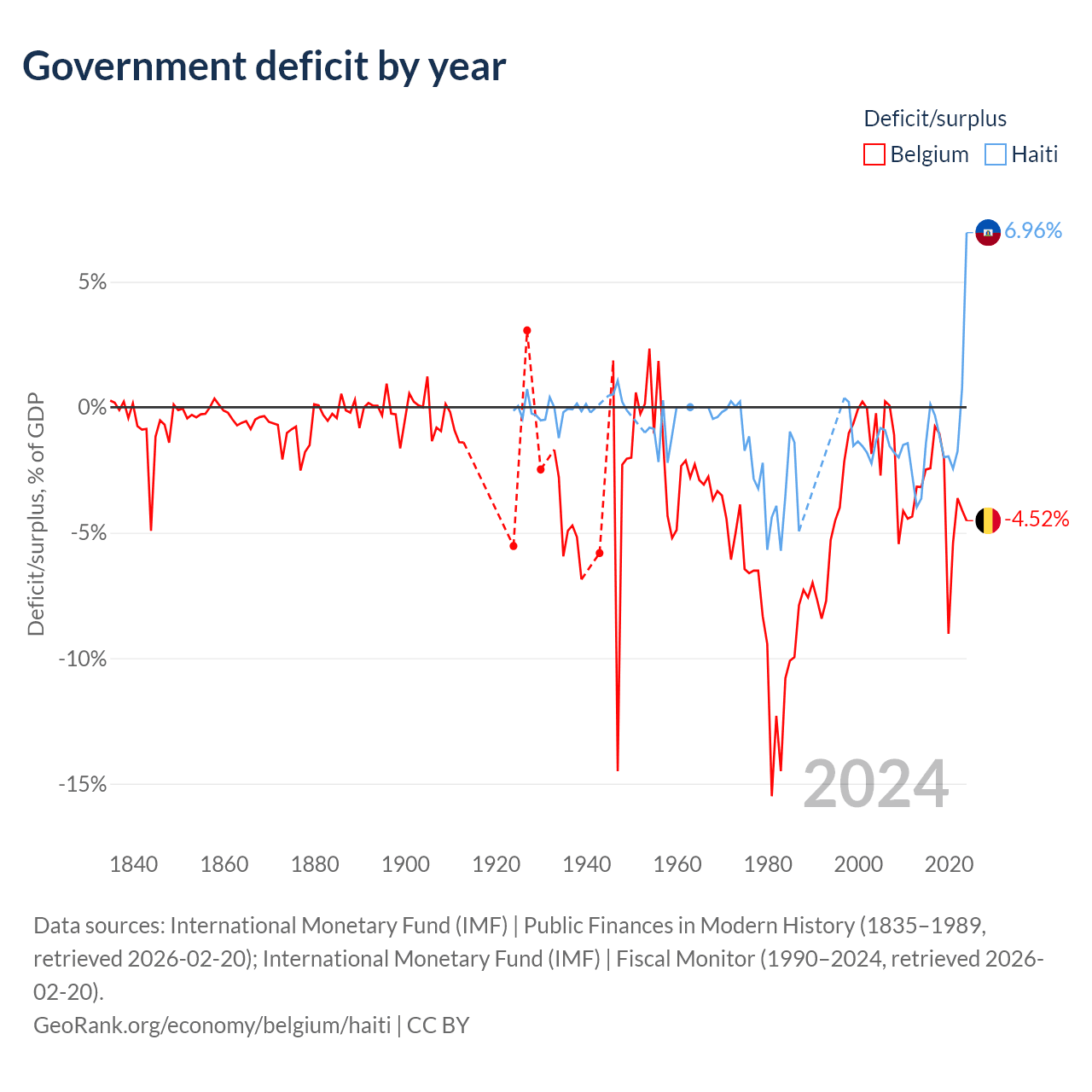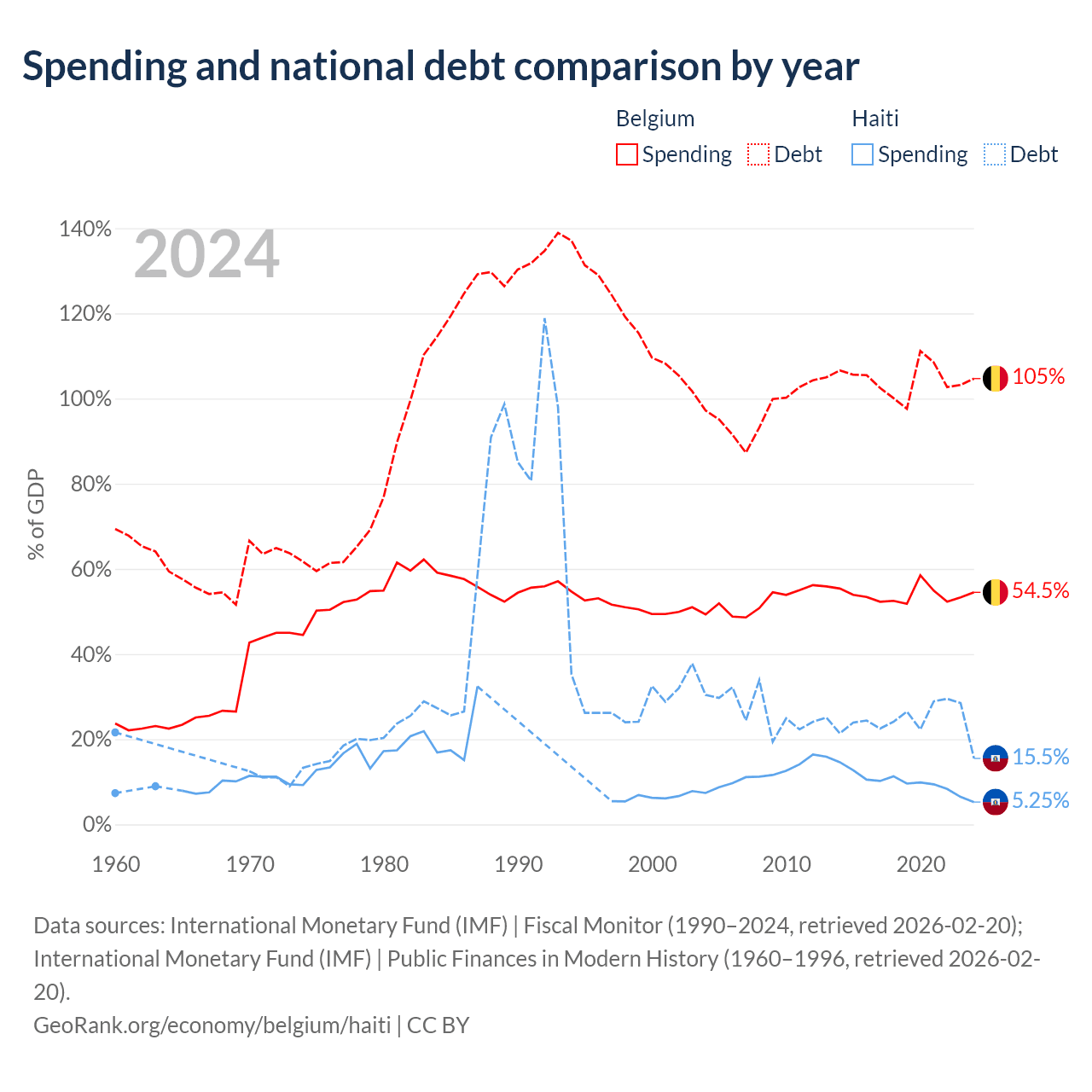 Belgium has $703B in government debt (104.7% of GDP), compared to $3.91B (15.5% of GDP) in Haiti.