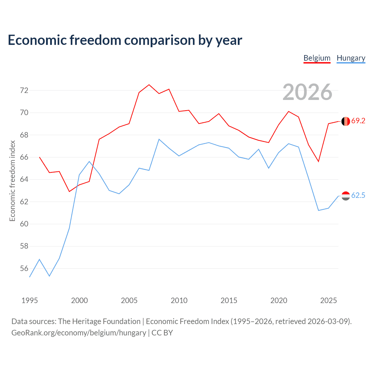 The Economic Freedom Index for Belgium is 69.2, ranking 42/197, compared to 62.5 for Hungary, ranking 86/197. The chart above displays a comparison of annual changes in economic freedom indexes.