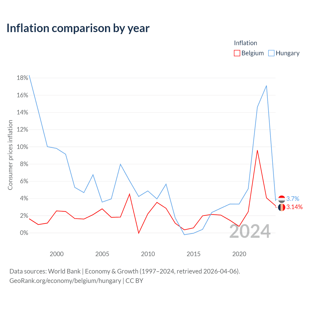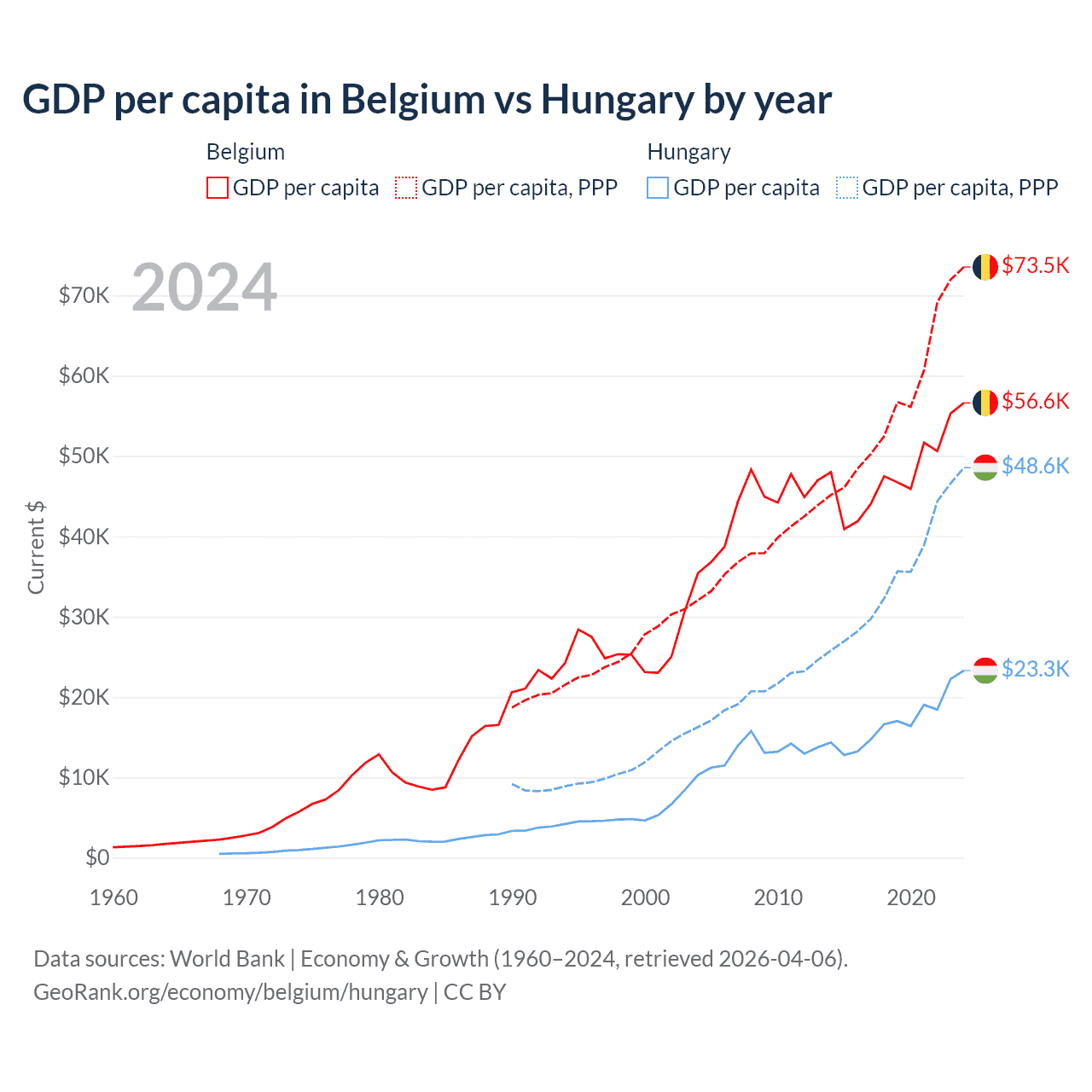 Belgium has a GDP of $671B compared to $223B for Hungary, ranking 23/197 and 55/197 by economy size, respectively.