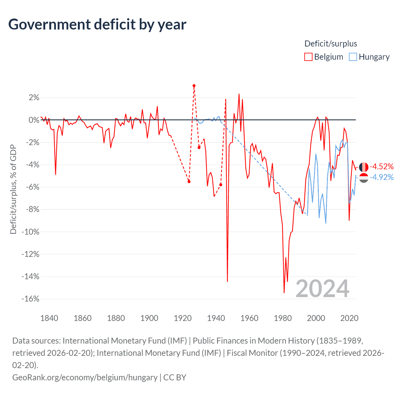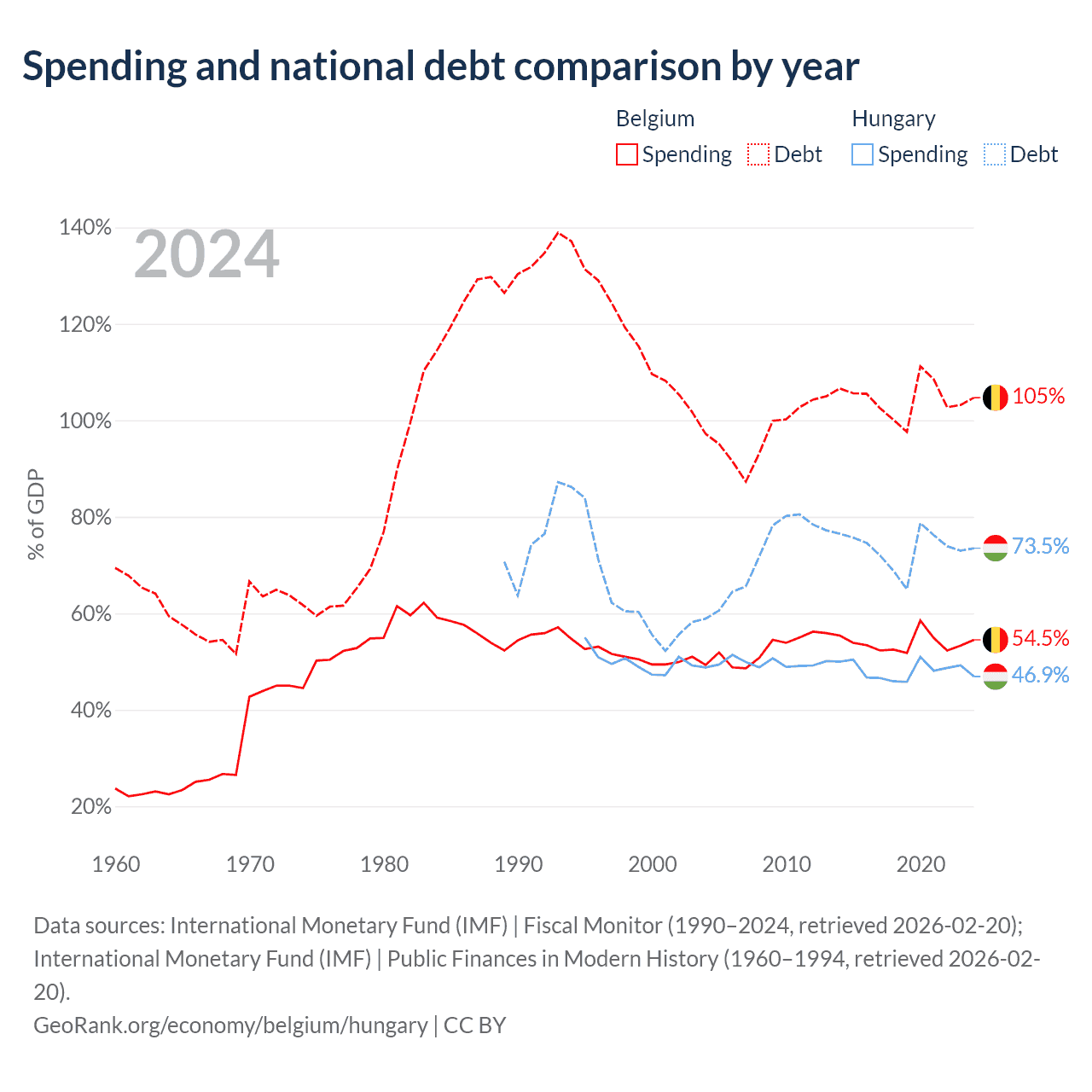 Belgium has $703B in government debt (104.7% of GDP), compared to $164B (73.5% of GDP) in Hungary.