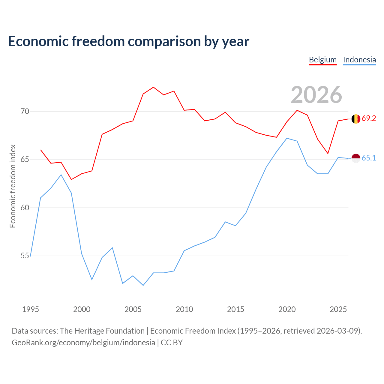 The Economic Freedom Index for Belgium is 69.2, ranking 42/197, compared to 65.1 for Indonesia, ranking 67/197. The chart above displays a comparison of annual changes in economic freedom indexes.