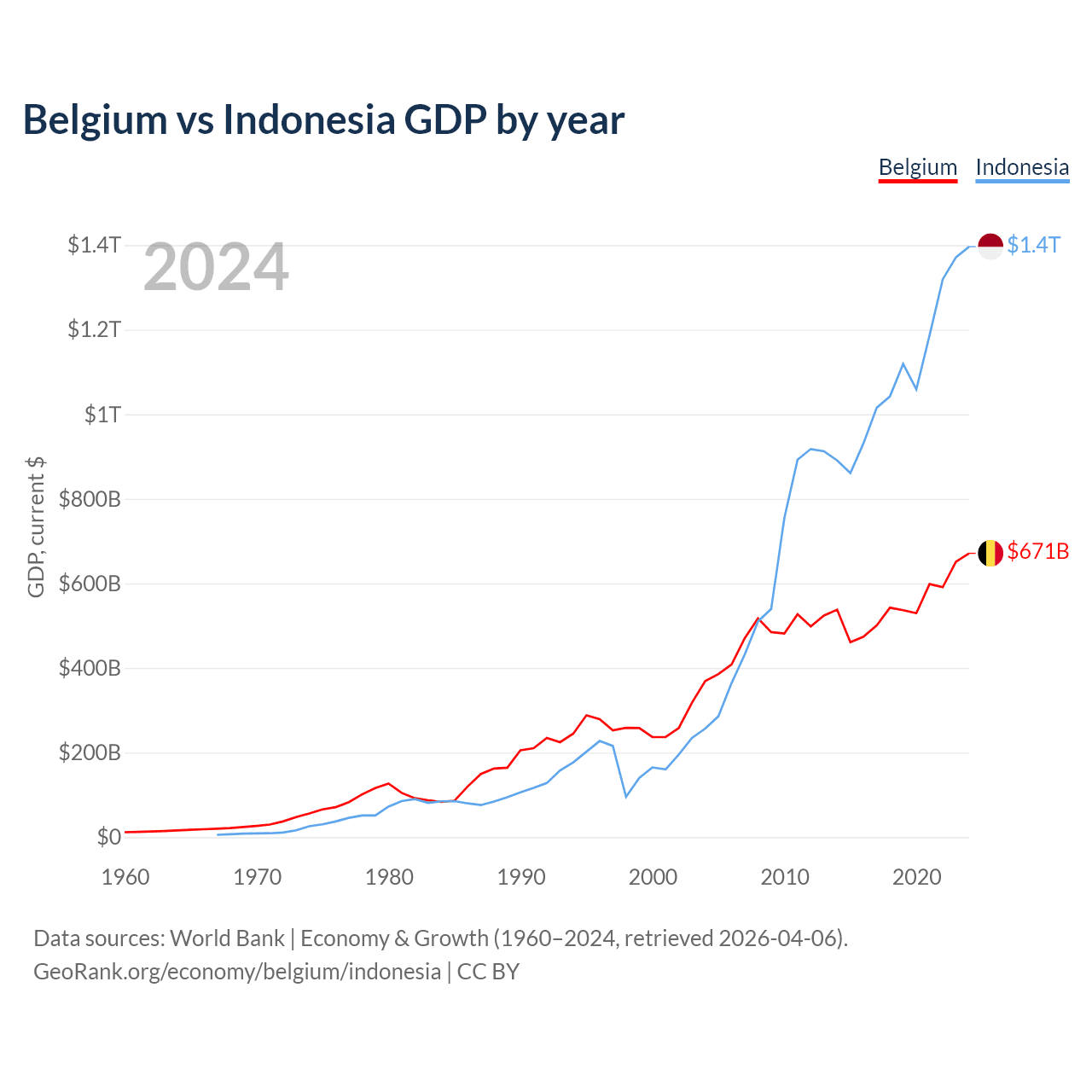 Belgium has a GDP of $671B compared to $1.4T for Indonesia, ranking 23/197 and 16/197 by economy size, respectively.