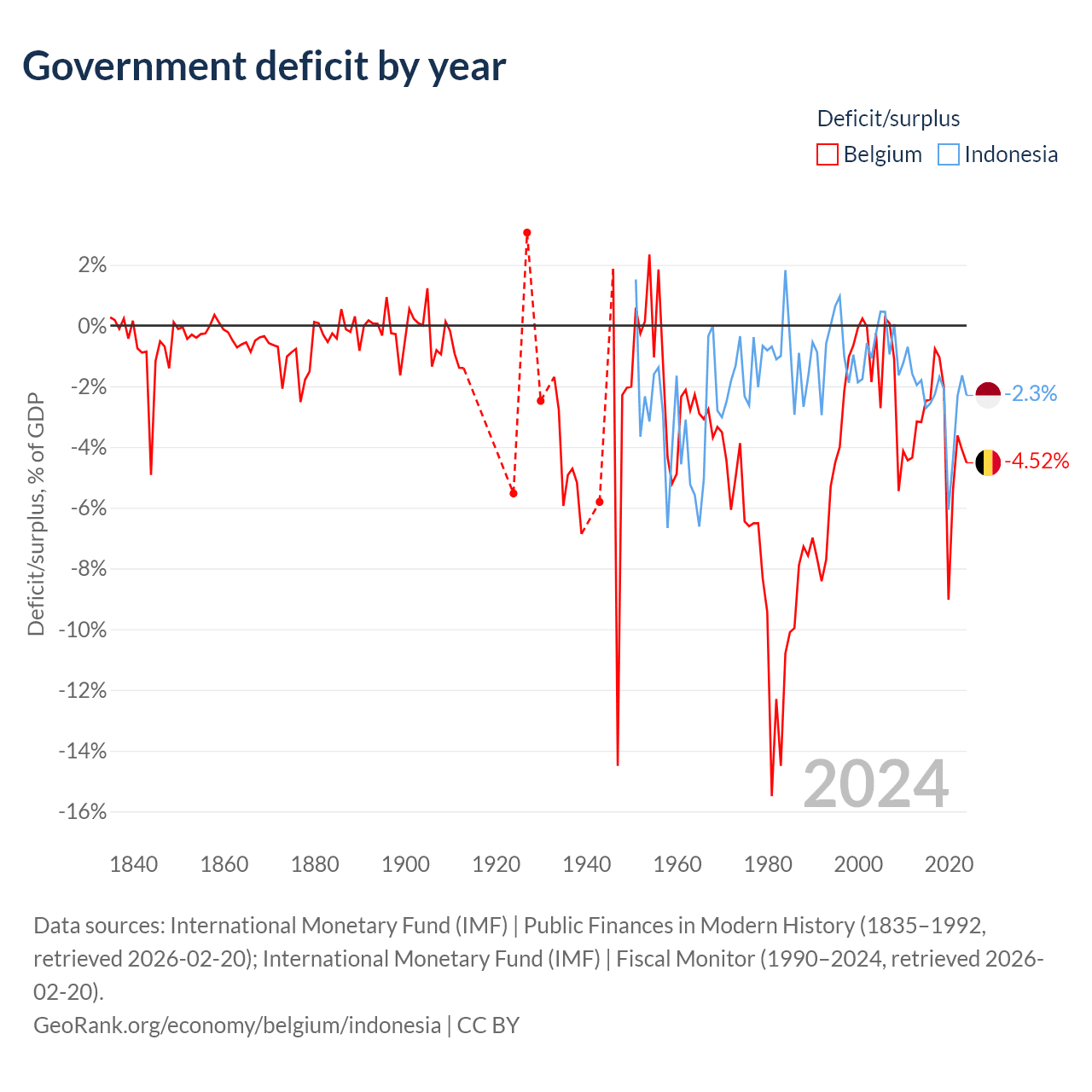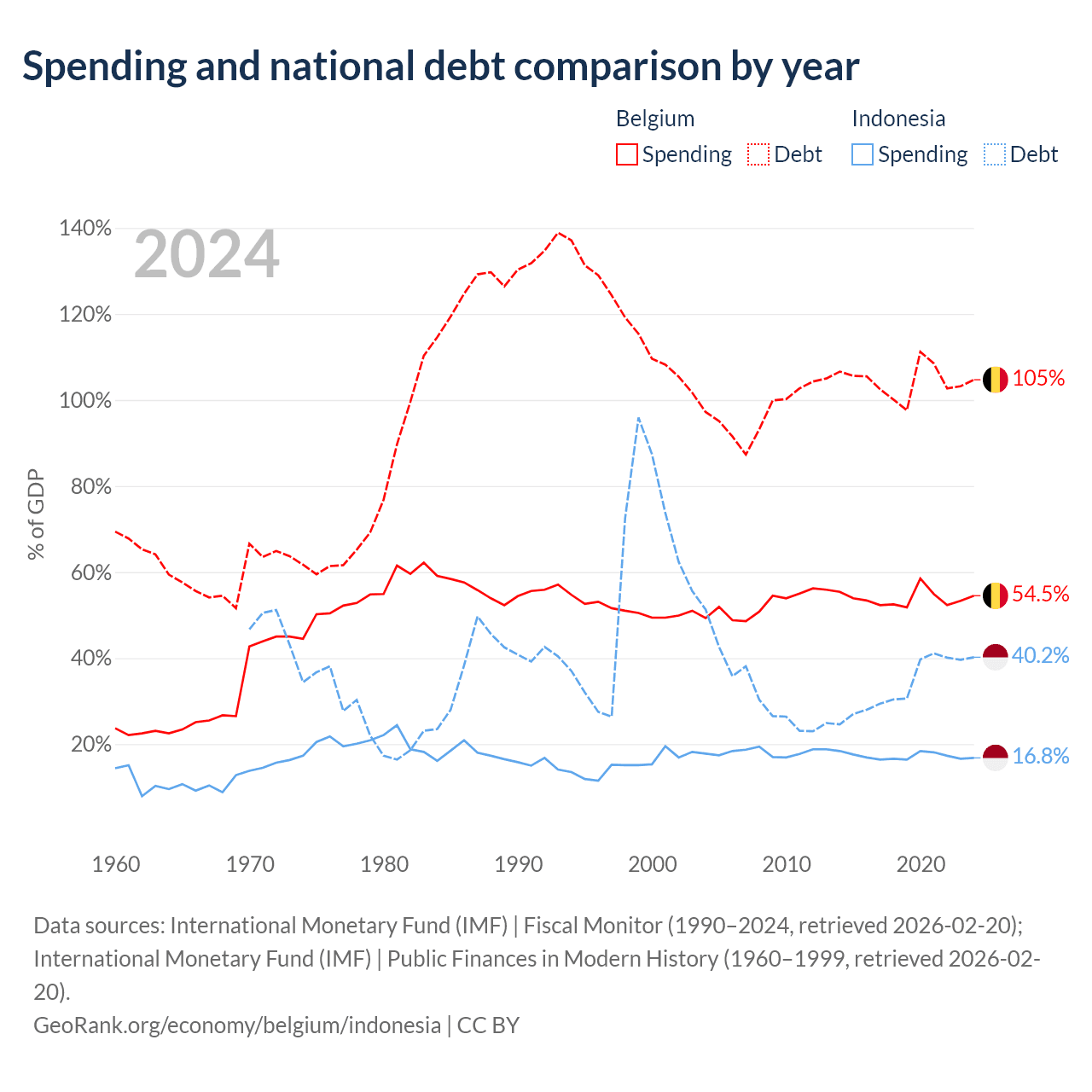 Belgium has $703B in government debt (104.7% of GDP), compared to $561B (40.2% of GDP) in Indonesia.