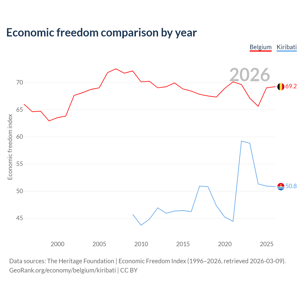 The Economic Freedom Index for Belgium is 69.2, ranking 42/197, compared to 50.8 for Kiribati, ranking 158/197. The chart above displays a comparison of annual changes in economic freedom indexes.