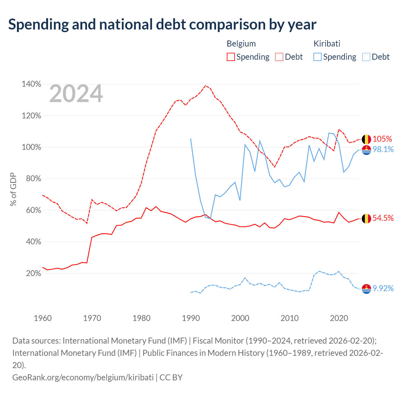 Belgium has $703B in government debt (104.7% of GDP), compared to $30.5M (9.92% of GDP) in Kiribati.