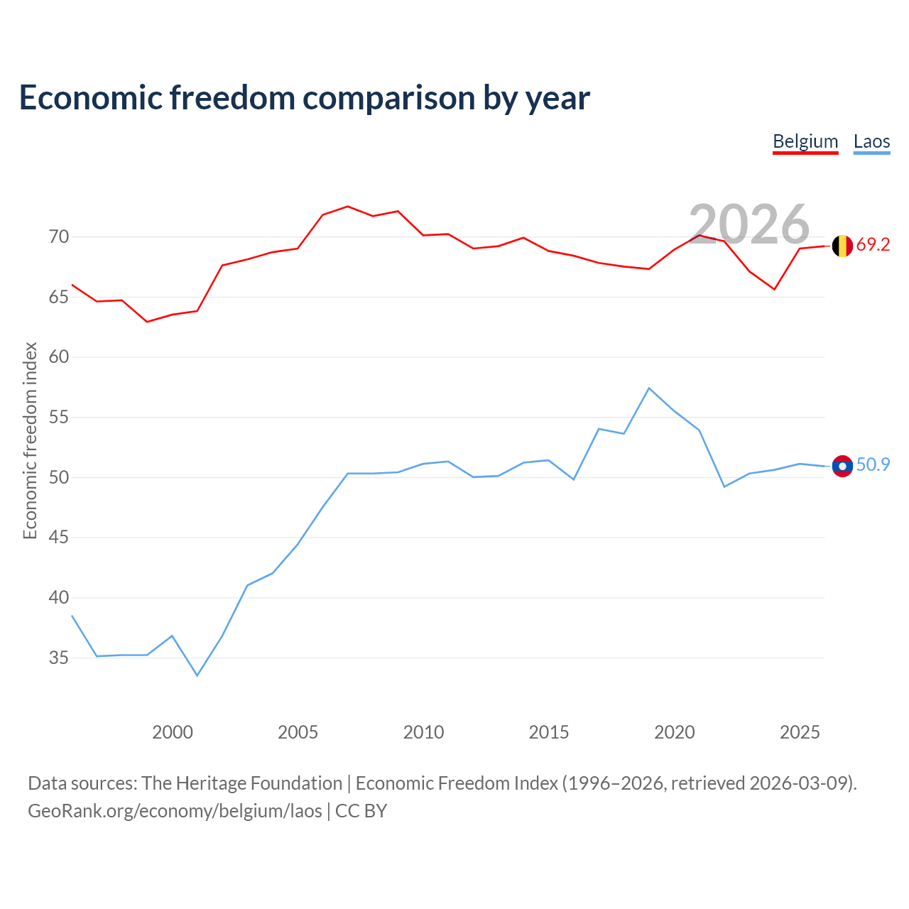 The Economic Freedom Index for Belgium is 69.2, ranking 42/197, compared to 50.9 for Laos, ranking 157/197. The chart above displays a comparison of annual changes in economic freedom indexes.