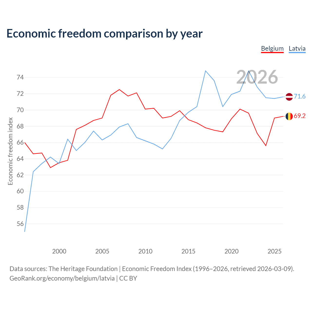 The Economic Freedom Index for Belgium is 69.2, ranking 42/197, compared to 71.6 for Latvia, ranking 31/197. The chart above displays a comparison of annual changes in economic freedom indexes.