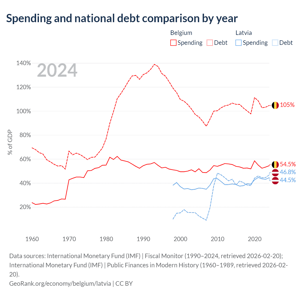 Belgium has $703B in government debt (104.7% of GDP), compared to $20.4B (46.8% of GDP) in Latvia.
