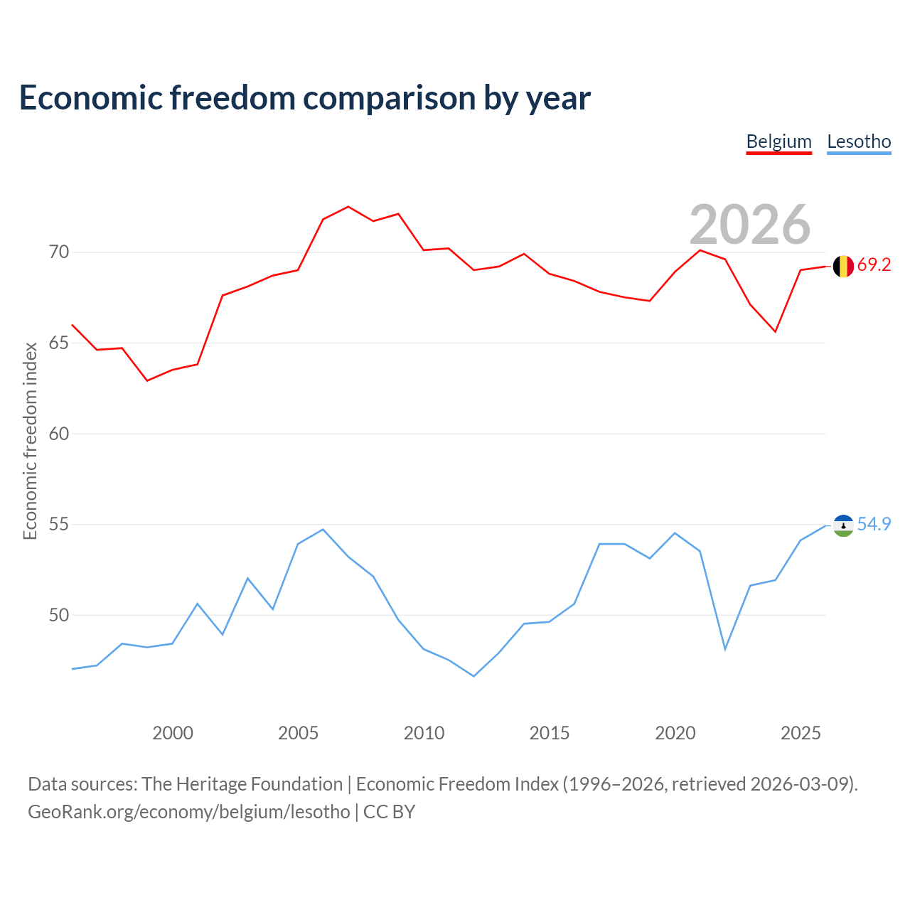 The Economic Freedom Index for Belgium is 69.2, ranking 42/197, compared to 54.9 for Lesotho, ranking 130/197. The chart above displays a comparison of annual changes in economic freedom indexes.