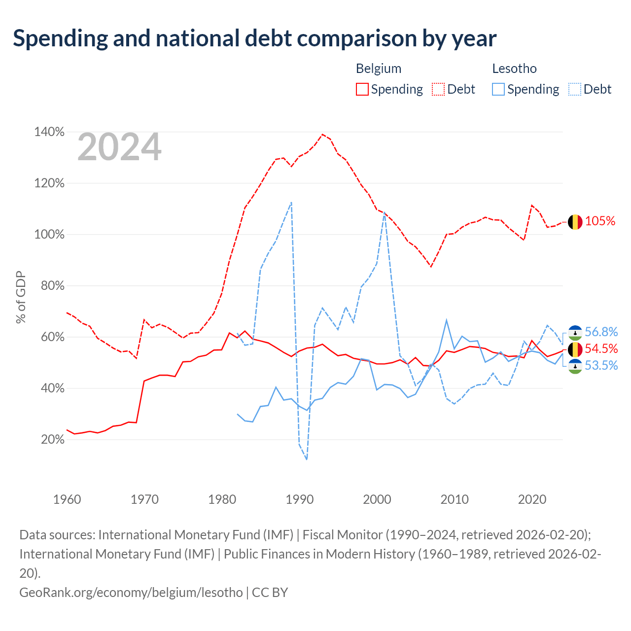 Belgium has $703B in government debt (104.7% of GDP), compared to $1.29B (56.8% of GDP) in Lesotho.
