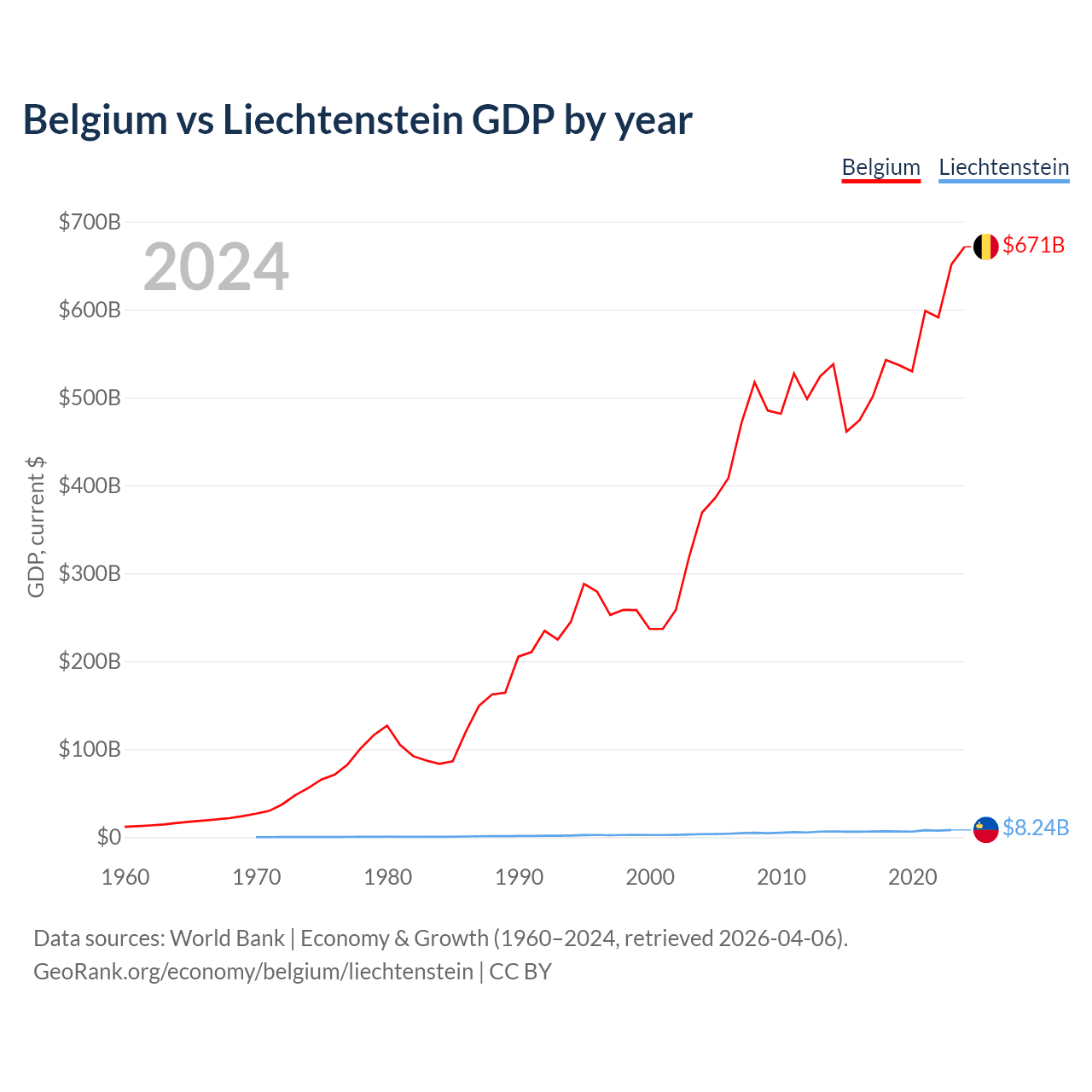 Belgium has a GDP of $671B compared to $8.24B for Liechtenstein, ranking 23/197 and 156/197 by economy size, respectively.