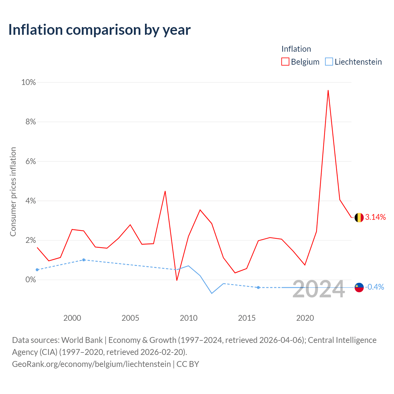 Over the past 24 years, Belgium has recorded an average annual inflation rate of 1.82%, compared with 0.04% in Liechtenstein. In 2020, inflation was 3.14% in Belgium and -0.4% in Liechtenstein.