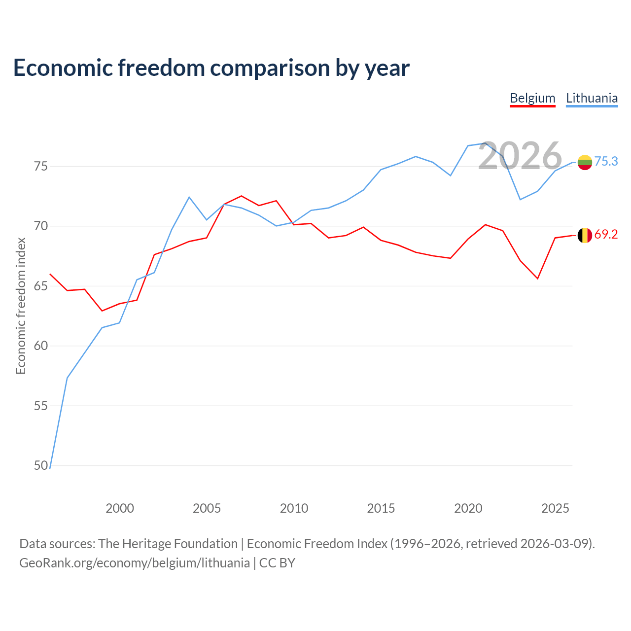 The Economic Freedom Index for Belgium is 69.2, ranking 42/197, compared to 75.3 for Lithuania, ranking 18/197. The chart above displays a comparison of annual changes in economic freedom indexes.