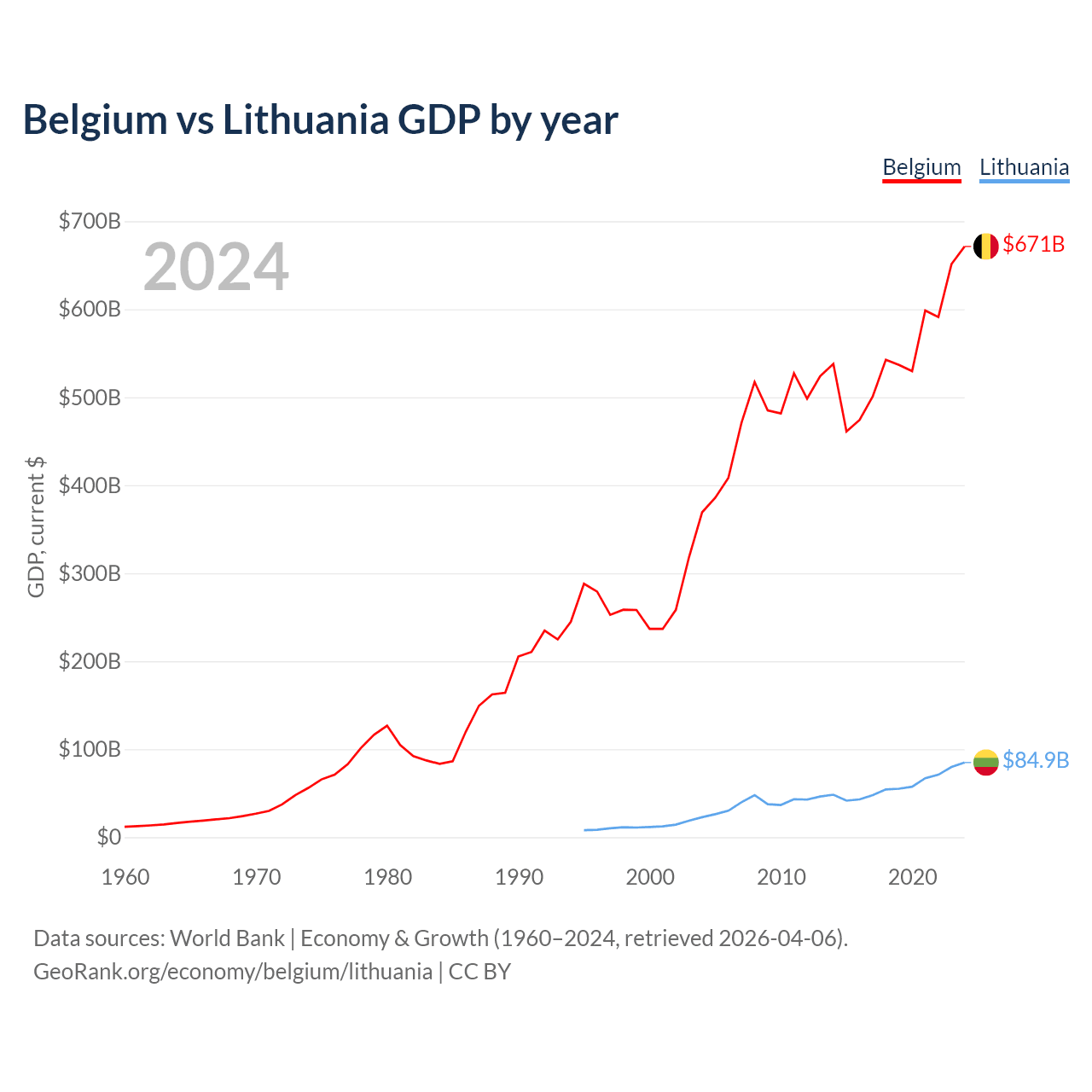 Belgium has a GDP of $671B compared to $84.9B for Lithuania, ranking 23/197 and 79/197 by economy size, respectively.
