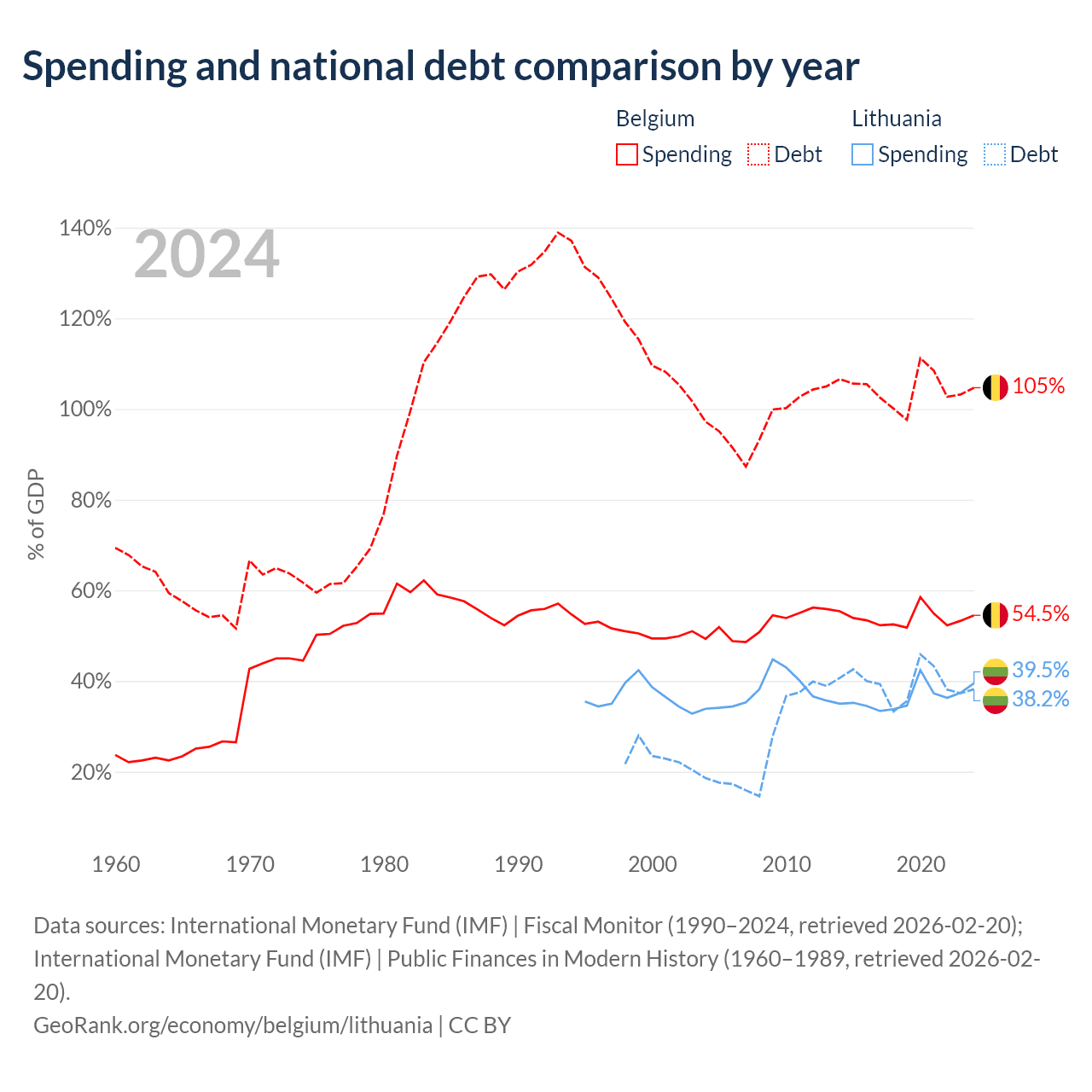 Belgium has $703B in government debt (104.7% of GDP), compared to $32.4B (38.2% of GDP) in Lithuania.