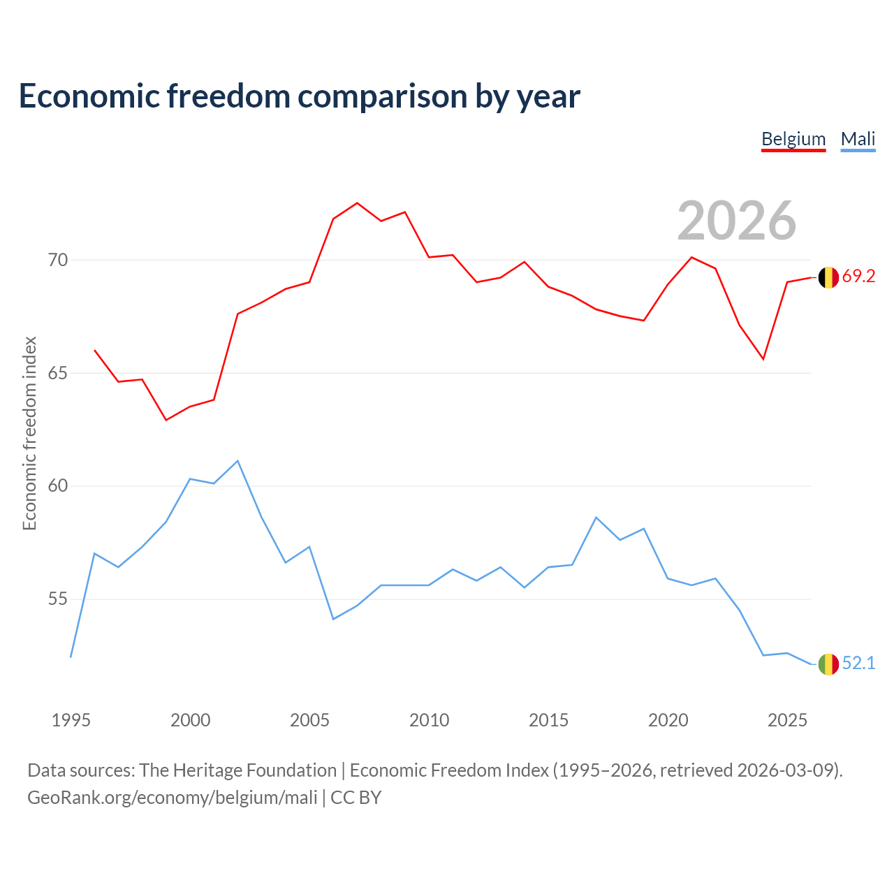 The Economic Freedom Index for Belgium is 69.2, ranking 42/197, compared to 52.1 for Mali, ranking 150/197. The chart above displays a comparison of annual changes in economic freedom indexes.