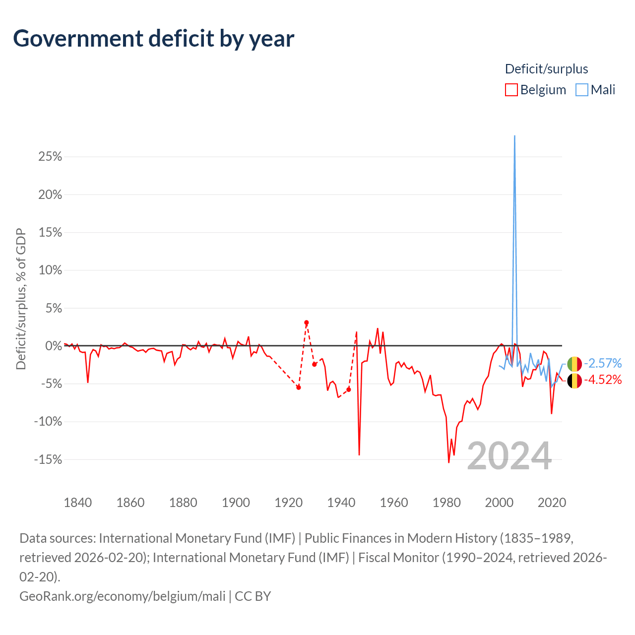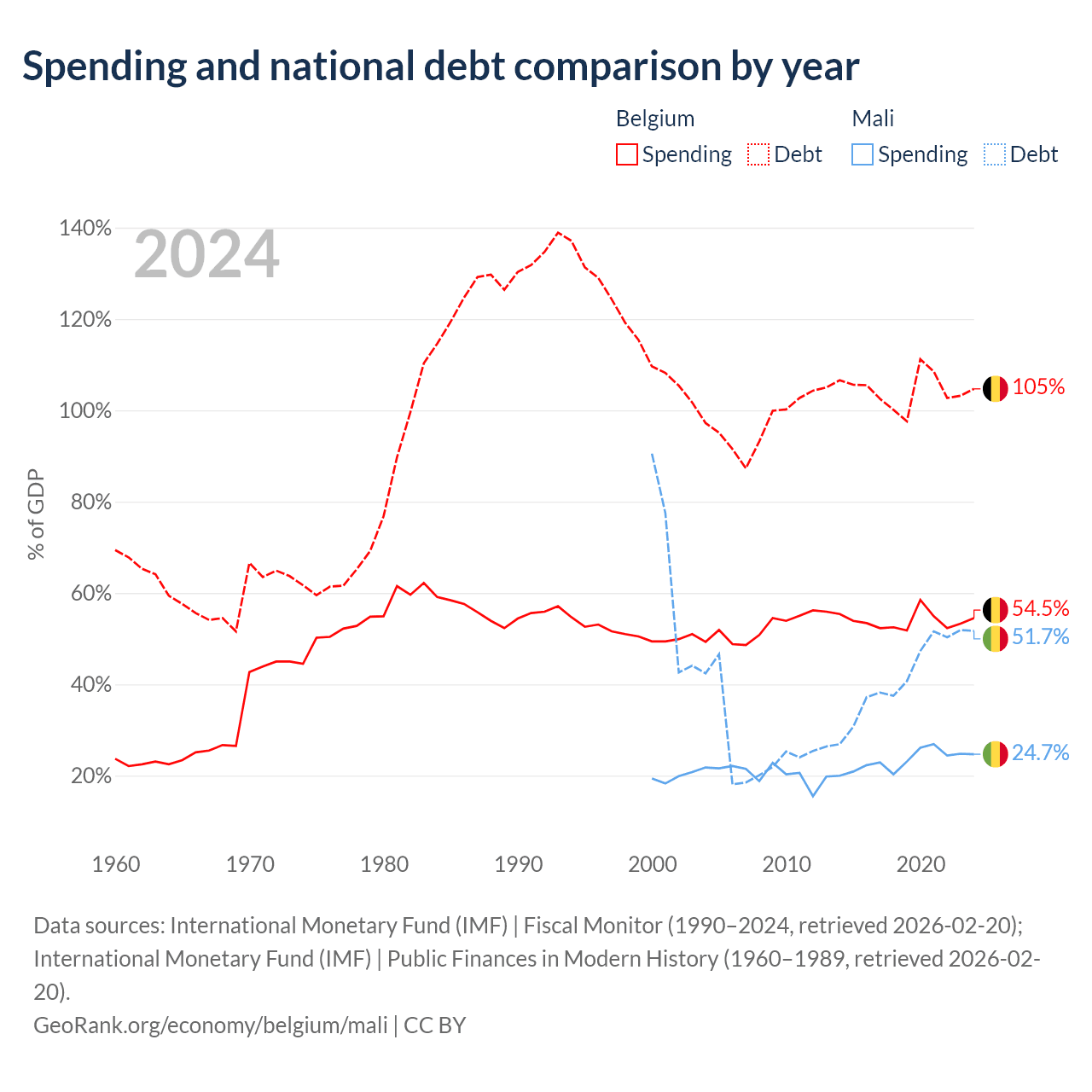 Belgium has $703B in government debt (104.7% of GDP), compared to $13.9B (51.7% of GDP) in Mali.