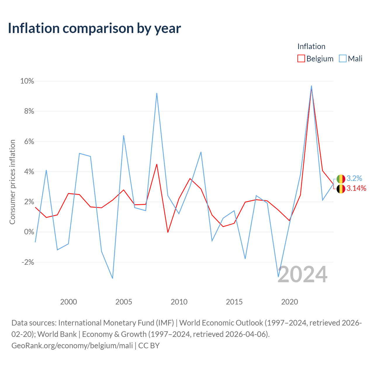 Belgium has a GDP of $671B compared to $26.8B for Mali, ranking 23/197 and 113/197 by economy size, respectively.