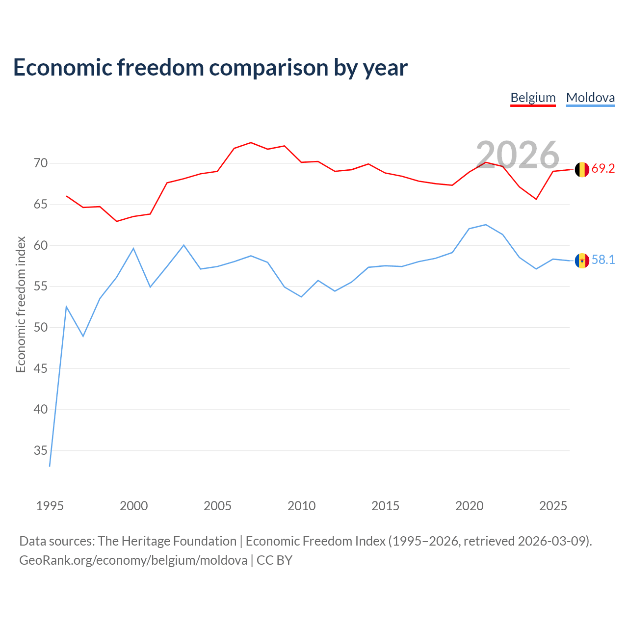The Economic Freedom Index for Belgium is 69.2, ranking 42/197, compared to 58.1 for Moldova, ranking 112/197. The chart above displays a comparison of annual changes in economic freedom indexes.