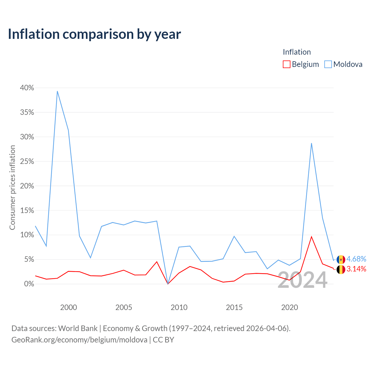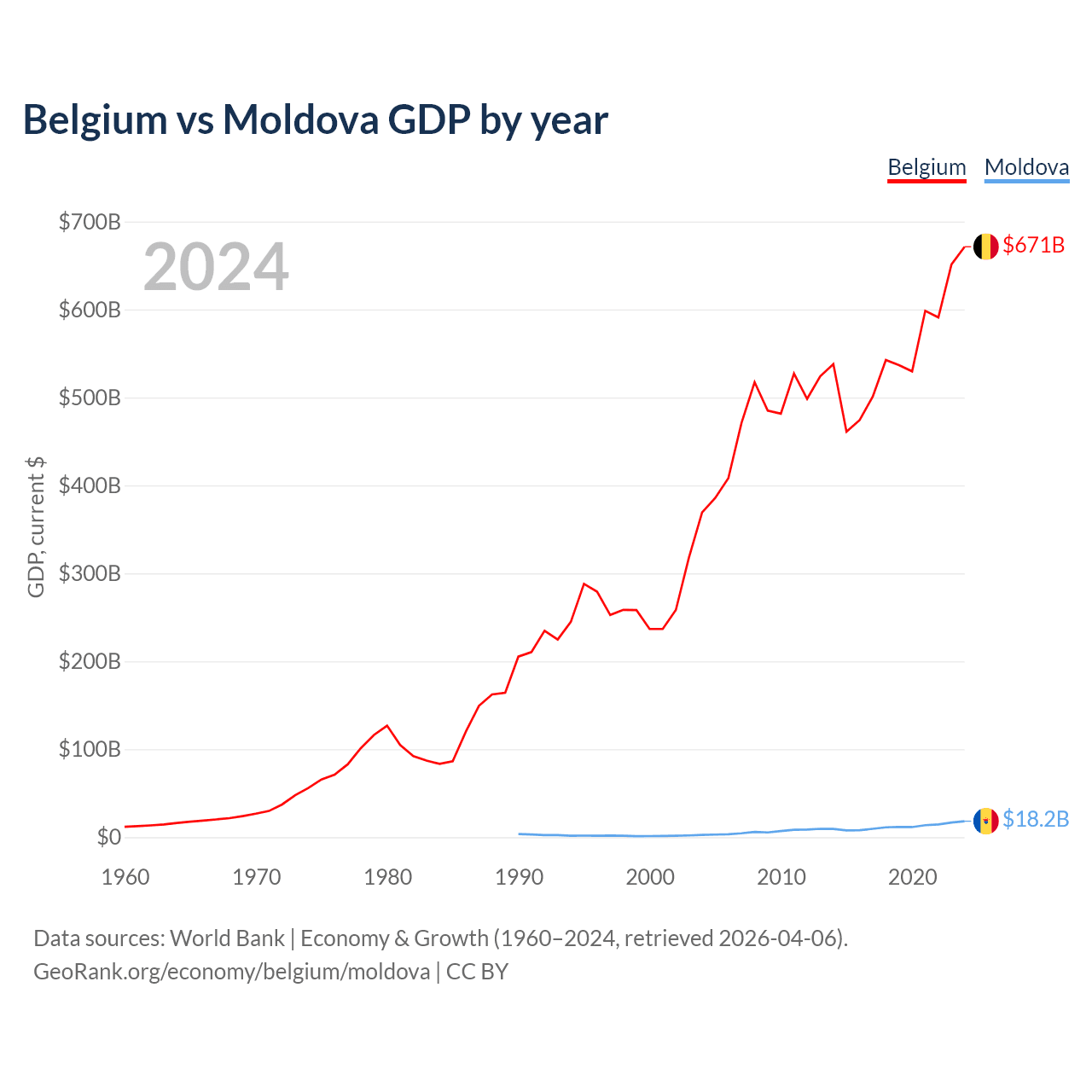 Belgium has a GDP of $671B compared to $18.2B for Moldova, ranking 23/197 and 134/197 by economy size, respectively.