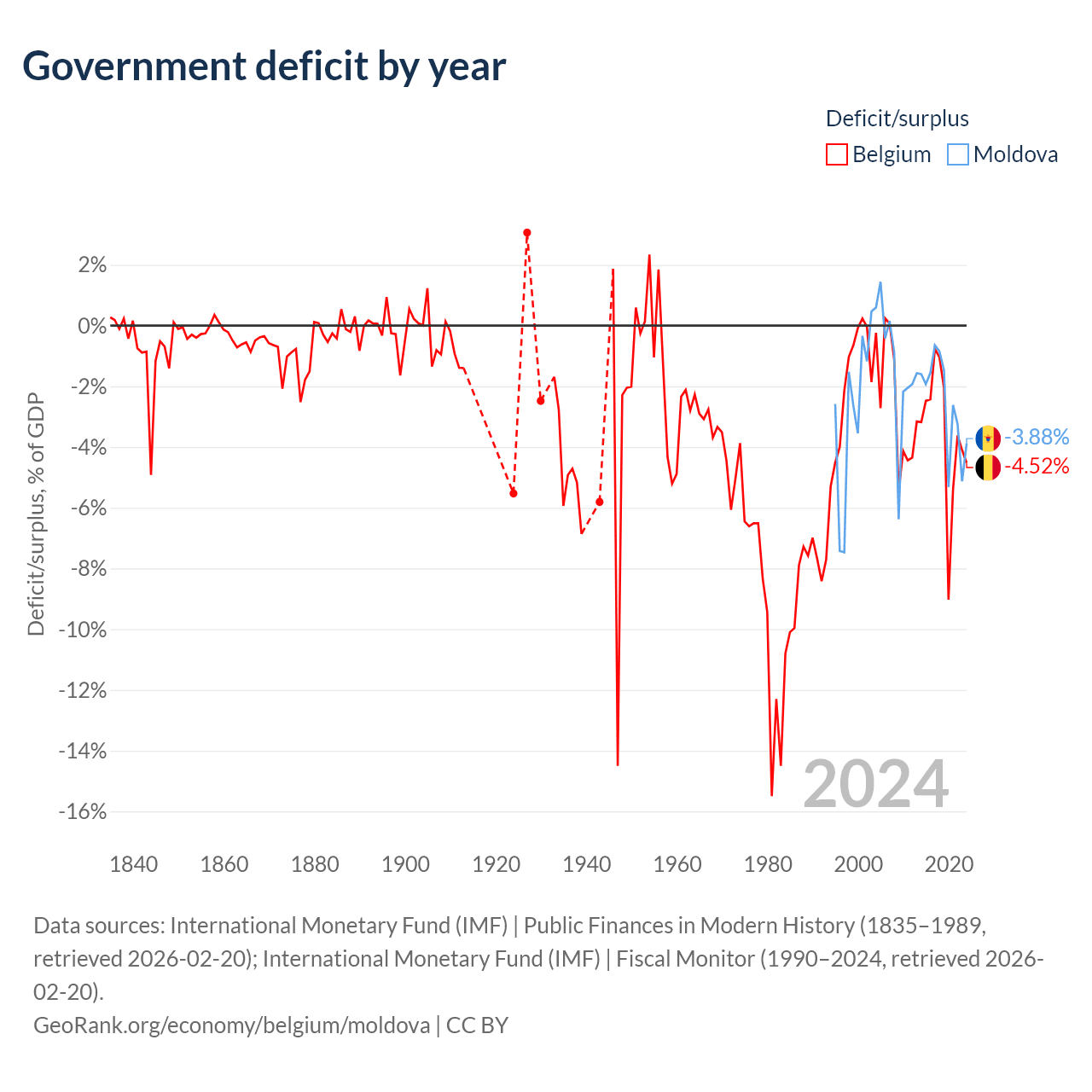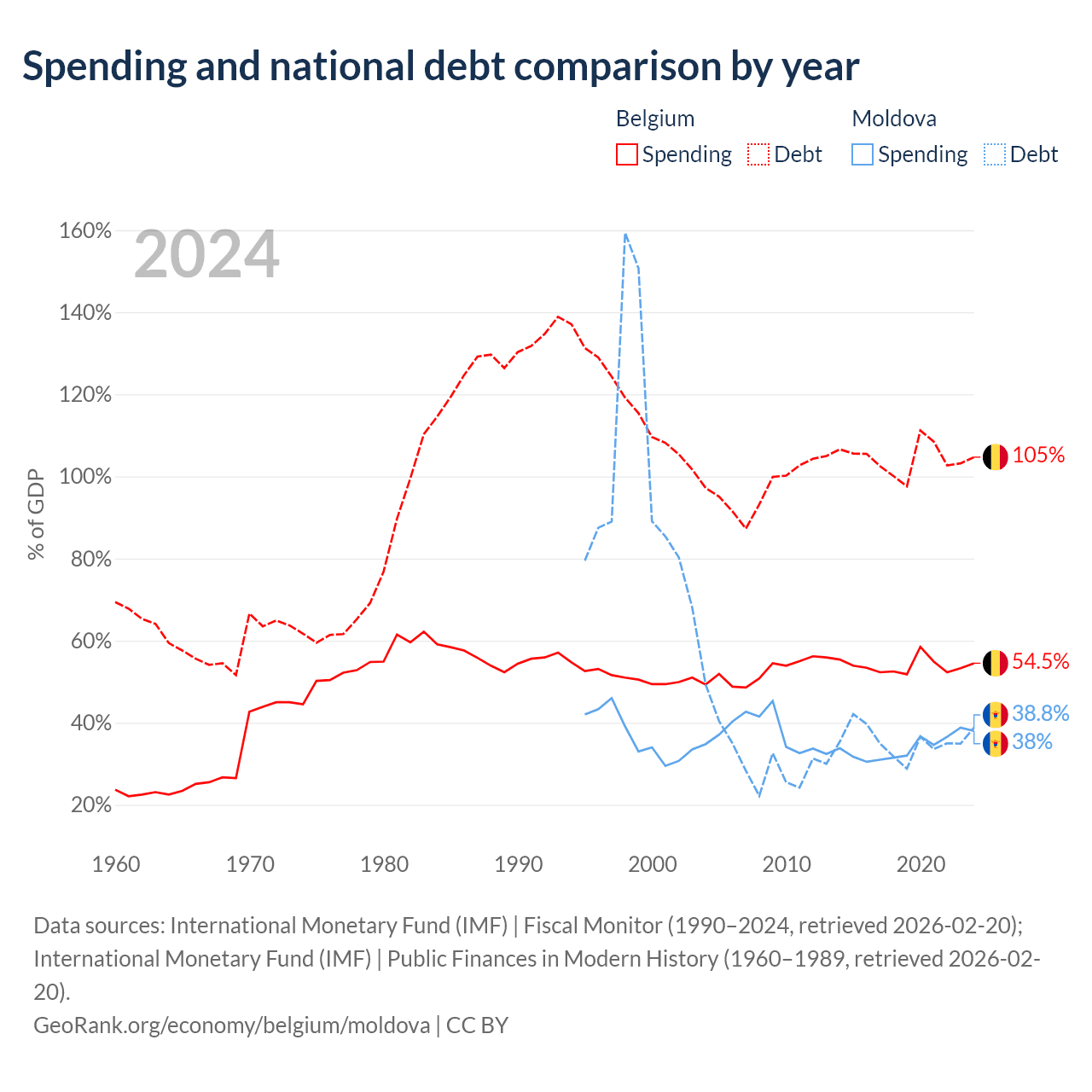 Belgium has $703B in government debt (104.7% of GDP), compared to $7.06B (38.8% of GDP) in Moldova.