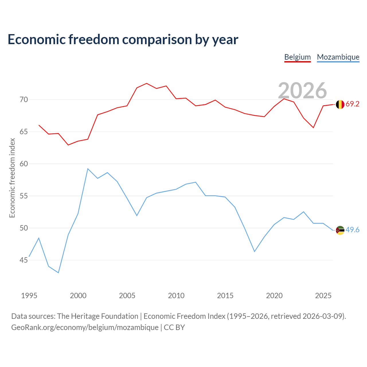 The Economic Freedom Index for Belgium is 69.2, ranking 42/197, compared to 49.6 for Mozambique, ranking 164/197. The chart above displays a comparison of annual changes in economic freedom indexes.