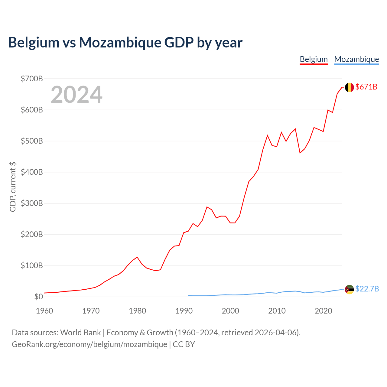 Belgium vs Mozambique GDP by year
