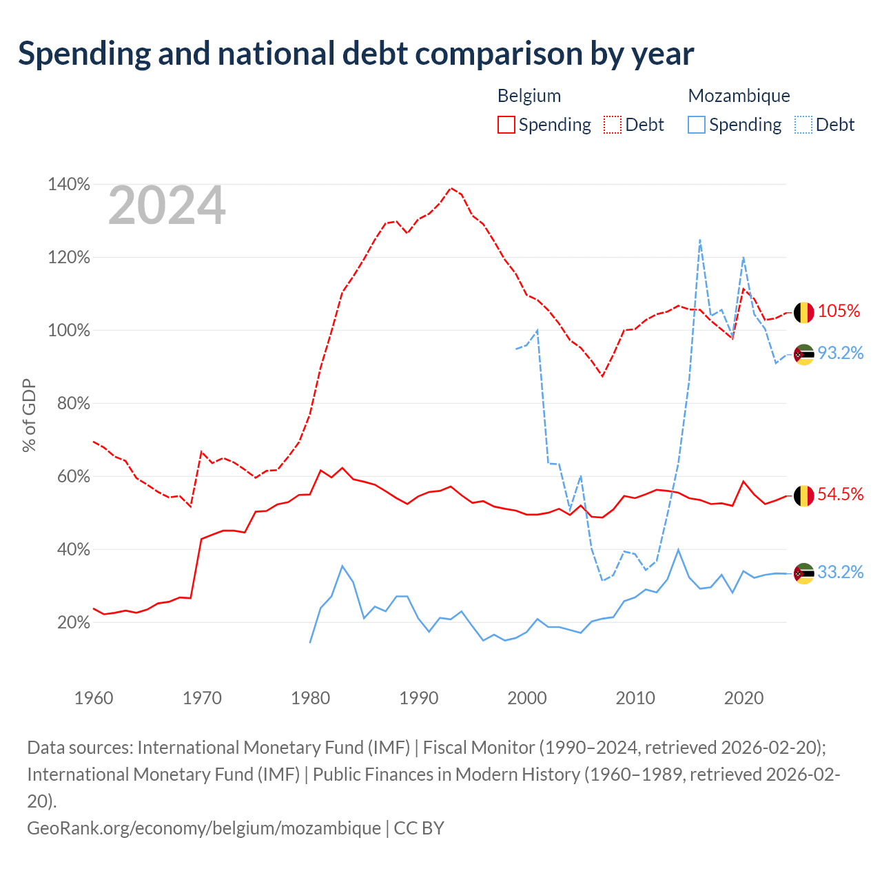 Belgium has $703B in government debt (104.7% of GDP), compared to $21.2B (93.2% of GDP) in Mozambique.